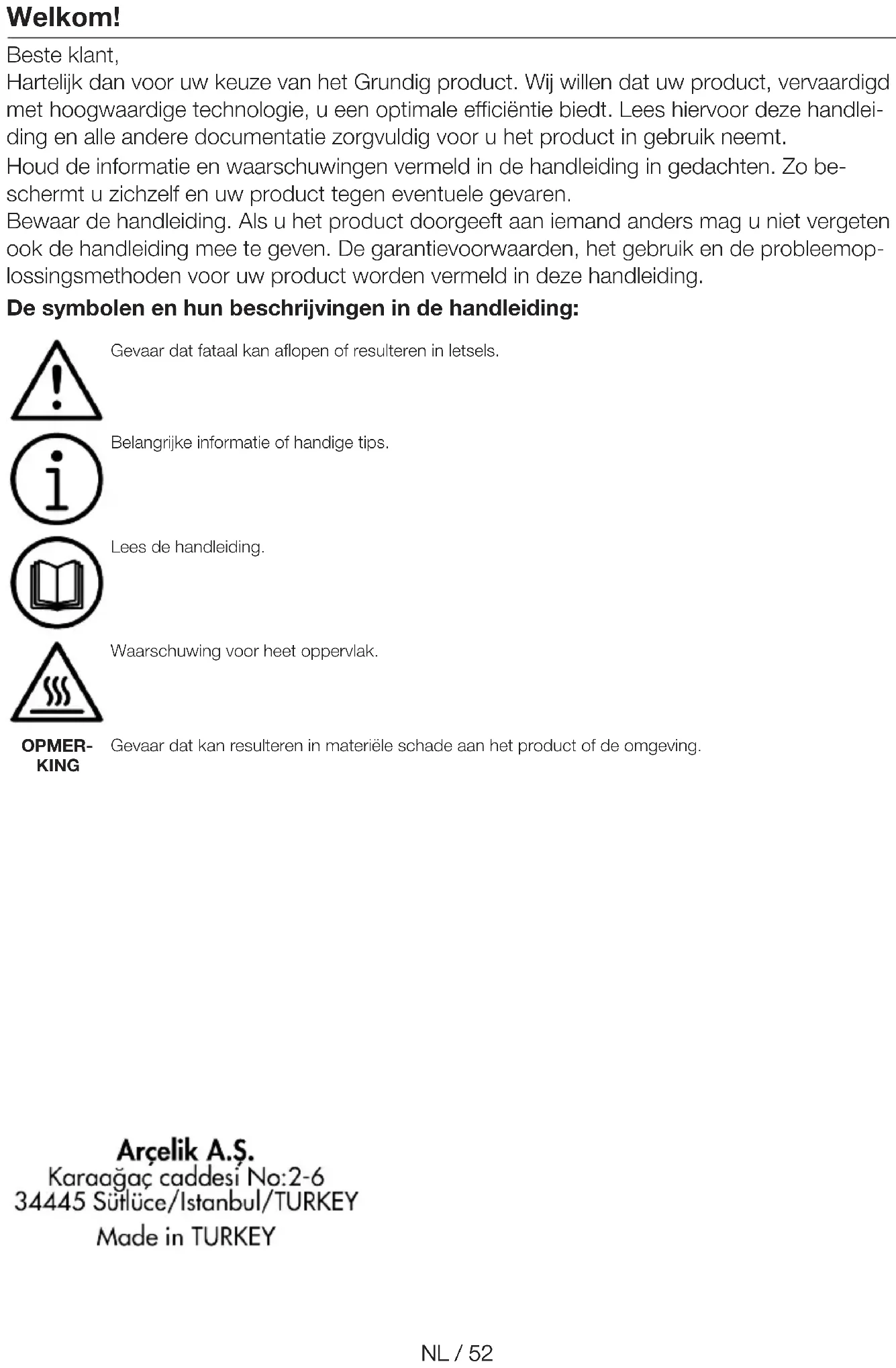 - La porte du four est peut-être ouverte. >>> Assurez-vous que la porte du four est complètement fermée. Contactez le ser- vice agréé si le problème persiste.NL / 52 Welkom! Beste klant, Hartelijk dan voor uw keuze van het Grundig product. Wij willen dat uw product, vervaardigd met hoogwaardige technologie, u een optimale efficiëntie biedt. Lees hiervoor deze handlei- ding en alle andere documentatie zorgvuldig voor u het product in gebruik neemt. Houd de informatie en waarschuwingen vermeld in de handleiding in gedachten. Zo be- schermt u zichzelf en uw product tegen eventuele gevaren. Bewaar de handleiding. Als u het product doorgeeft aan iemand anders mag u niet vergeten ook de handleiding mee te geven. De garantievoorwaarden, het gebruik en de probleemop- lossingsmethoden voor uw product worden vermeld in deze handleiding. De symbolen en hun beschrijvingen in de handleiding: Gevaar dat fataal kan aflopen of resulteren in letsels. Belangrijke informatie of handige tips. Lees de handleiding. Waarschuwing voor heet oppervlak. OPMER- KING Gevaar dat kan resulteren in materiële schade aan het product of de omgeving.NL / 53 Inhoudsopgave 1 Veiligheidsinstructies.................... 54