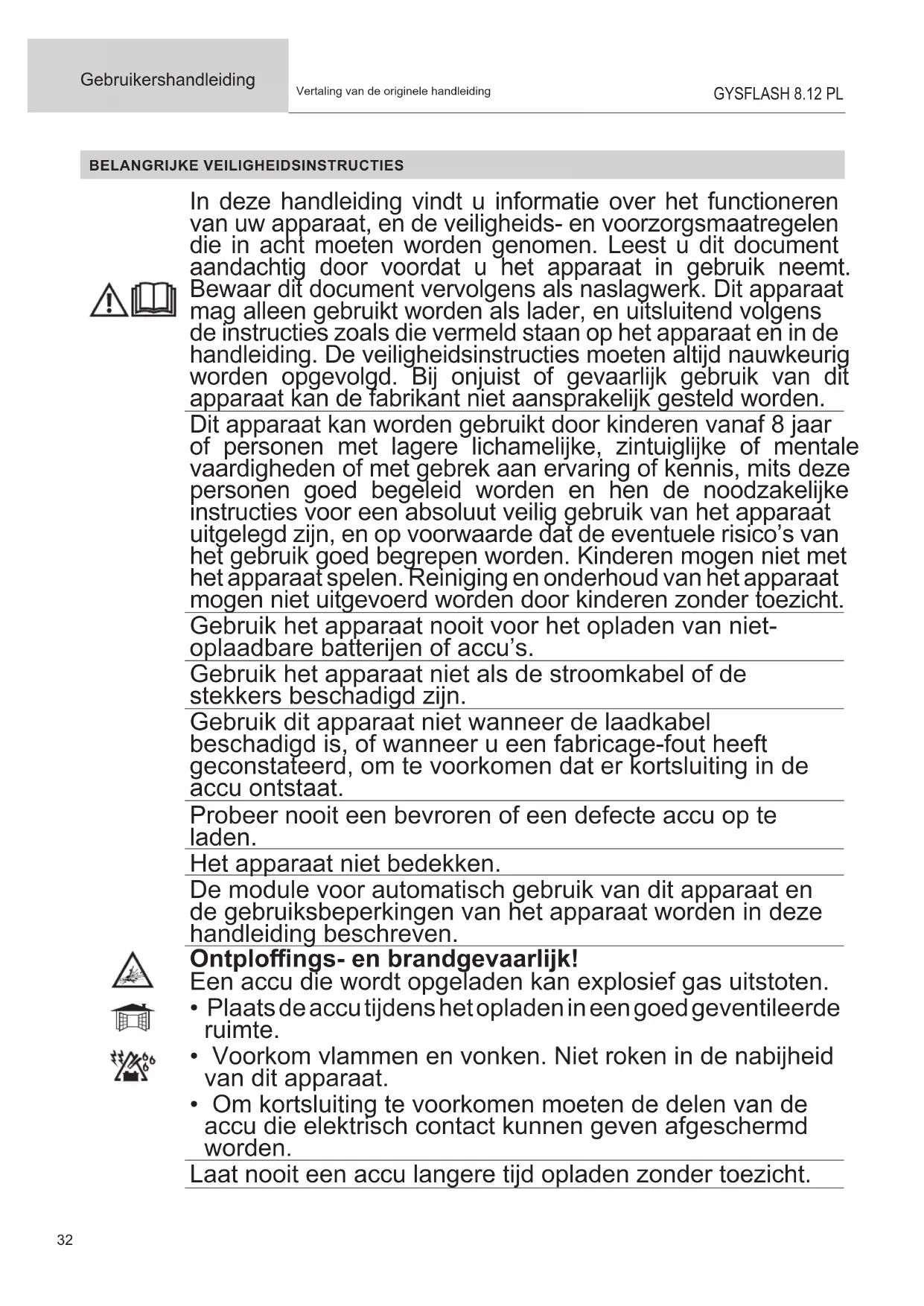 - Случаи выхода из строя из-за окружающей среды (загрязнение воздуха, коррозия, пыль). При выходе из строя, обратитесь в пункт покупки аппарата с предъявлением следующих документов: - документ, подтверждающий покупку (с датой): кассовый чек, инвойс.... - описание поломки.32 Gebruikershandleiding GYSFLASH 8.12 PL Vertaling van de originele handleiding BELANGRIJKE VEILIGHEIDSINSTRUCTIES In deze handleiding vindt u informatie over het functioneren van uw apparaat, en de veiligheids- en voorzorgsmaatregelen die in acht moeten worden genomen. Leest u dit document aandachtig door voordat u het apparaat in gebruik neemt. Bewaar dit document vervolgens als naslagwerk. Dit apparaat mag alleen gebruikt worden als lader, en uitsluitend volgens de instructies zoals die vermeld staan op het apparaat en in de handleiding. De veiligheidsinstructies moeten altijd nauwkeurig worden opgevolgd. Bij onjuist of gevaarlijk gebruik van dit apparaat kan de fabrikant niet aansprakelijk gesteld worden. Dit apparaat kan worden gebruikt door kinderen vanaf 8 jaar of personen met lagere lichamelijke, zintuiglijke of mentale vaardigheden of met gebrek aan ervaring of kennis, mits deze personen goed begeleid worden en hen de noodzakelijke instructies voor een absoluut veilig gebruik van het apparaat uitgelegd zijn, en op voorwaarde dat de eventuele risico’s van het gebruik goed begrepen worden. Kinderen mogen niet met het apparaat spelen. Reiniging en onderhoud van het apparaat mogen niet uitgevoerd worden door kinderen zonder toezicht. Gebruik het apparaat nooit voor het opladen van niet- oplaadbare batterijen of accu’s. Gebruik het apparaat niet als de stroomkabel of de stekkers beschadigd zijn. Gebruik dit apparaat niet wanneer de laadkabel beschadigd is, of wanneer u een fabricage-fout heeft geconstateerd, om te voorkomen dat er kortsluiting in de accu ontstaat. Probeer nooit een bevroren of een defecte accu op te laden. Het apparaat niet bedekken. De module voor automatisch gebruik van dit apparaat en de gebruiksbeperkingen van het apparaat worden in deze handleiding beschreven. Ontplongs- en brandgevaarlijk! Een accu die wordt opgeladen kan explosief gas uitstoten.