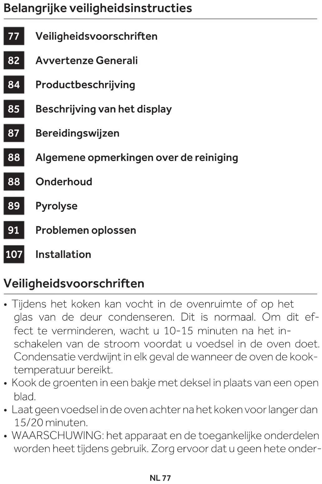- Tijdens het koken kan vocht in de ovenruimte of op het glas van de deur condenseren. Dit is normaal. Om dit ef- fect te verminderen, wacht u 10-15 minuten na het in- schakelen van de stroom voordat u voedsel in de oven doet. Condensatie verdwijnt in elk geval de wanneer de oven de kook- temperatuur bereikt.