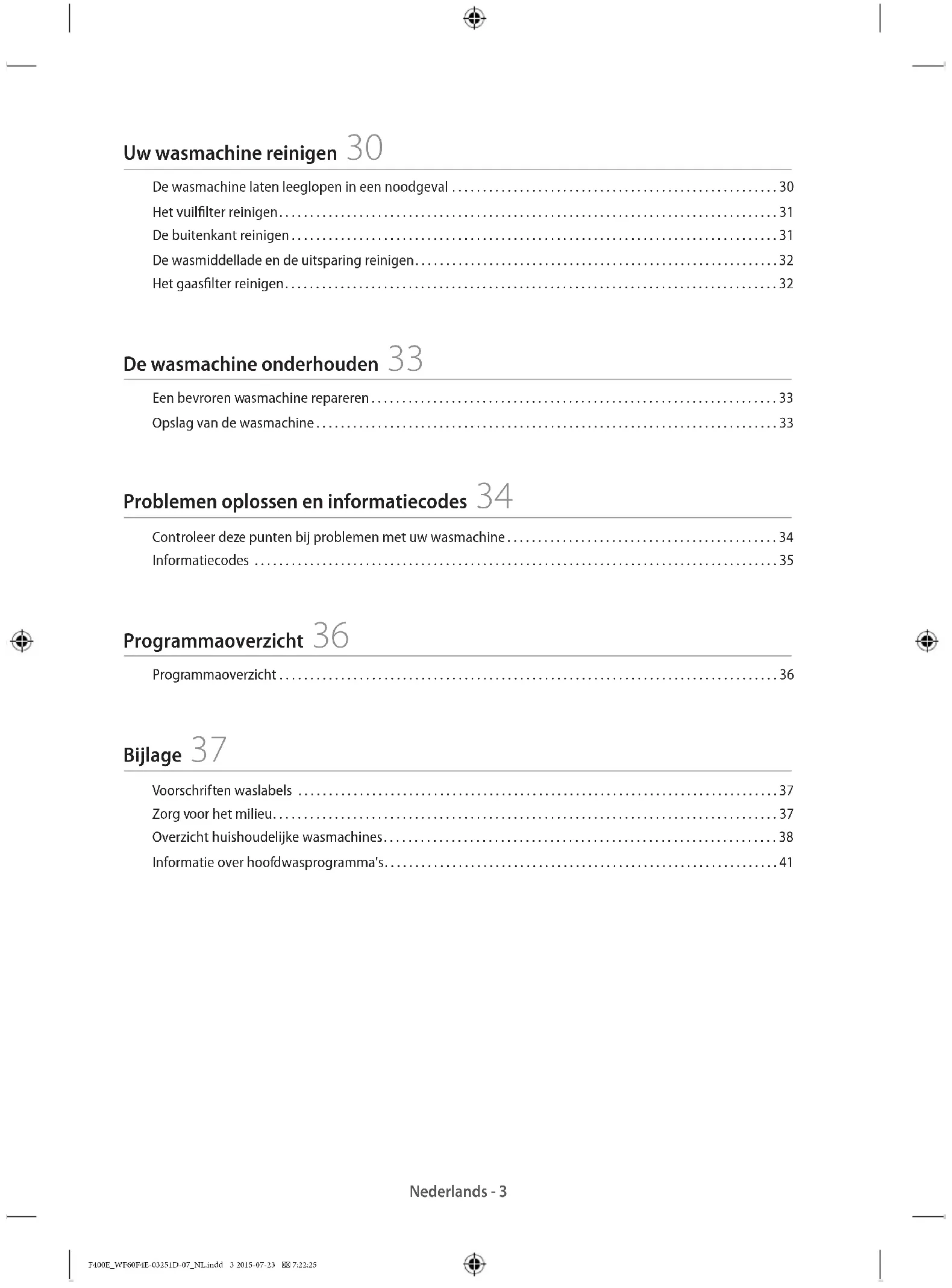 - F400E_WF60F4E-03251D-07_NL.indd 2 2015-07-23 7:22:25Nederlands - 3 Uw wasmachine reinigen 30 De wasmachine laten leeglopen in een noodgeval p. 30