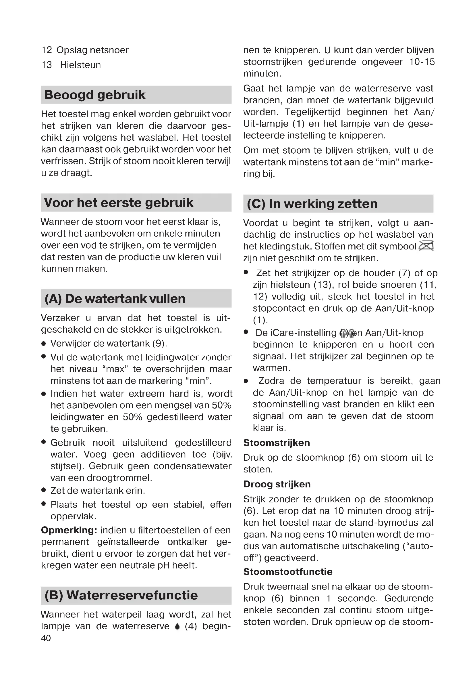 Plaats het toestel op een stabiel, een oppervlak. Opmerking: indien u filtertoestellen of een permanent geïnstalleerde ontkalker ge- bruikt, dient u ervoor te zorgen dat het ver- kregen water een neutrale pH heeft. (B) Waterreservefunctie Wanneer het waterpeil laag wordt, zal het lampje van de waterreserve (4) begin- nen te knipperen. U kunt dan verder blijven stoomstrijken gedurende ongeveer 10-15 minuten. Gaat het lampje van de waterreserve vast branden, dan moet de watertank bijgevuld worden. Tegelijkertijd beginnen het Aan/ Uit-lampje (1) en het lampje van de gese- lecteerde instelling te knipperen. Om met stoom te blijven strijken, vult u de watertank minstens tot aan de “min” marke- ring bij. (C) In werking zetten Voordat u begint te strijken, volgt u aan- dachtig de instructies op het waslabel van het kledingstuk. Stoen met dit symbool zijn niet geschikt om te strijken.