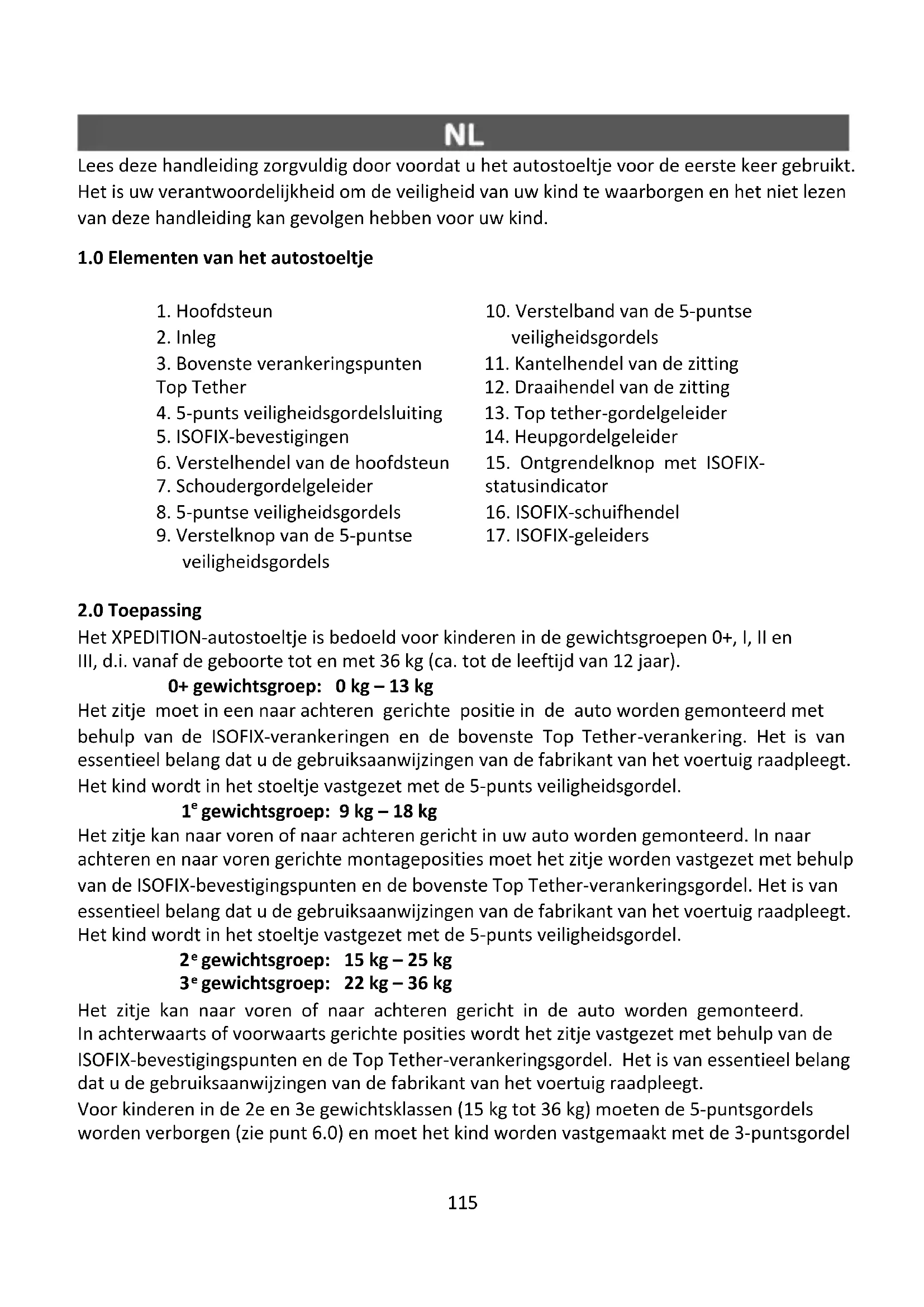 Het XPEDITION-autostoeltje is bedoeld voor kinderen in de gewichtsgroepen 0+, I, II en III, d.i. vanaf de geboorte tot en met 36 kg (ca. tot de leeftijd van 12 jaar). 0+ gewichtsgroep: 0 kg – 13 kg Het zitje moet in een naar achteren gerichte positie in de auto worden gemonteerd met behulp van de ISOFIX-verankeringen en de bovenste Top Tether-verankering. Het is van essentieel belang dat u de gebruiksaanwijzingen van de fabrikant van het voertuig raadpleegt. Het kind wordt in het stoeltje vastgezet met de 5-punts veiligheidsgordel.