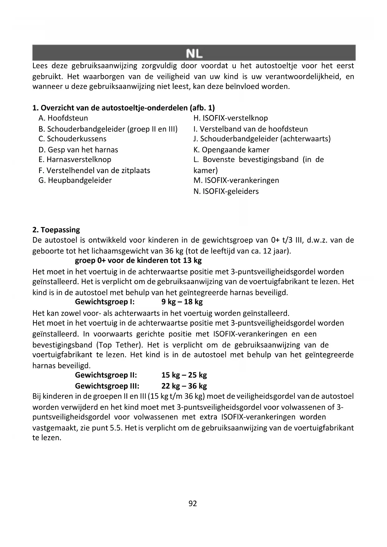 De autostoel is ontwikkeld voor kinderen in de gewichtsgroep van 0+ t/3 III, d.w.z. van de geboorte tot het lichaamsgewicht van 36 kg (tot de leeftijd van ca. 12 jaar). groep 0+ voor de kinderen tot 13 kg Het moet in het voertuig in de achterwaartse positie met 3-puntsveiligheidsgordel worden geïnstalleerd. Het is verplicht om de gebruiksaanwijzing van de voertuigfabrikant te lezen. Het kind is in de autostoel met behulp van het geïntegreerde harnas beveiligd. Gewichtsgroep I: 9 kg – 18 kg Het kan zowel voor- als achterwaarts in het voertuig worden geïnstalleerd. Het moet in het voertuig in de achterwaartse positie met 3-puntsveiligheidsgordel worden geïnstalleerd. In voorwaarts gerichte positie met ISOFIX-verankeringen en een bevestigingsband (Top Tether). Het is verplicht om de gebruiksaanwijzing van de voertuigfabrikant te lezen. Het kind is in de autostoel met behulp van het geïntegreerde harnas beveiligd. Gewichtsgroep II: 15 kg – 25 kg Gewichtsgroep III: 22 kg – 36 kg Bij kinderen in de groepen II en III (15 kg t/m 36 kg) moet de veiligheidsgordel van de autostoel worden verwijderd en het kind moet met 3-puntsveiligheidsgordel voor volwassenen of 3- puntsveiligheidsgordel voor volwassenen met extra ISOFIX-verankeringen worden vastgemaakt, zie punt 5.5. Het is verplicht om de gebruiksaanwijzing van de voertuigfabrikant te lezen.93