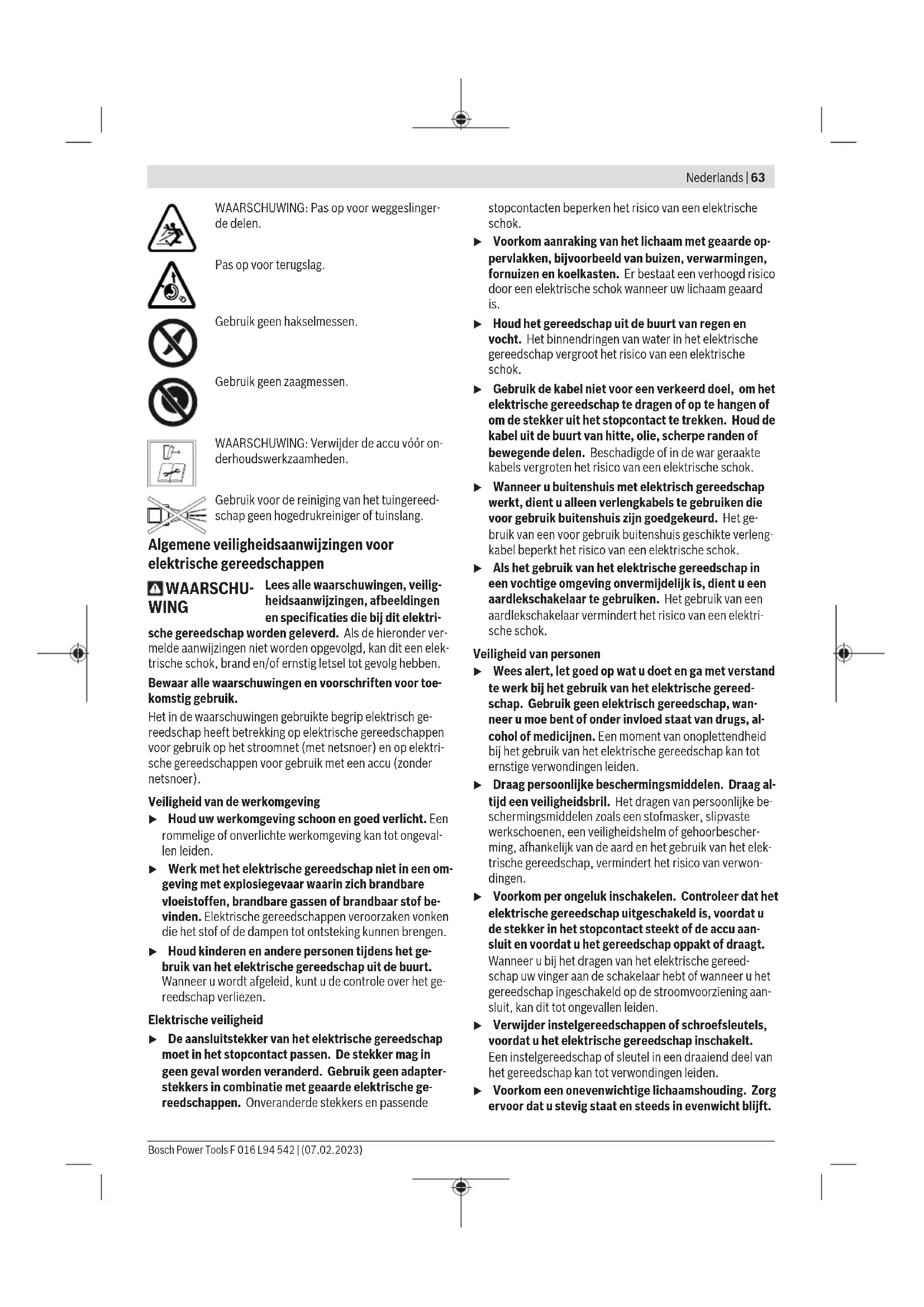 Utilizzare correttamente l'elettroutensile ed ac- cenderlo e spegnerlo più volte in rapida succes- sione. Blocco troppo difficile per il sistema per rimuo- verlo automaticamente e senza un supporto ma- nuale Togliere la batteria ricaricabile e rimuovere ma- nualmente il blocco Manutenzione ed assistenza Manutenzione, pulizia e magazzinaggio u Rimuovere la batteria ricaricabile dall’apparecchio per il giardinaggio prima di qualsiasi intervento sull'apparecchio stesso (ades. manutenzione, cambio dell’utensile ecc.) nonché durante il suo trasporto e la conservazione. In caso di azionamento accidentale dell’interruttore di avvio/arresto esiste pericolo di lesioni. u Tenere il prodotto e le fessure di ventilazione puliti per poter lavorare bene ed in modo sicuro. Pulire e effettuare la manutenzione del prodotto prima del magazzinaggio. Non appoggiare nessun altro oggetto sull’apparecchio per il giardinaggio. Non spruzzare mai il prodotto con acqua. Non immergere mai il prodotto in acqua. Immagazzinare il prodotto in un posto sicuro ed asciutto e al di fuori della portata dei bambini. Non appoggiare nessun altro oggetto sul prodotto. Non lasciare il prodotto appoggiato a terra. Potreste inciam- parci sopra. Assicurarsi sempre che tutti i dadi, i perni e le viti siano ben serrati affinché sia possibile lavorare in modo sicuro con il prodotto. Controllare il prodotto e per ragioni di sicurezza sostituire parti usurate o danneggiate. Accertarsi che le parti di ricambio da sostituire provengano da Bosch. Il prodotto non deve essere modificato, ogni modifica può causare lesioni. Bosch Power Tools F 016 L94 542 | (07.02.2023)62 | Nederlands Affilatura e equilibratura della lama di taglio L'affilatura e equilibratura corretta della lama di taglio richie- de molta pratica. Bosch raccomanda di utilizzare una lama di taglio di ricambio omologata. Una lama di taglio di ricambio è disponibile presso un Centro di Assistenza autorizzato. Trasporto del decespugliatore Durante il trasporto e il magazzinaggio coprire sempre la la- ma da taglio con una protezione adatta. Trasportare il decespugliatore con una mano, ben bilanciato all'asta, con l'adattatore di taglio rivolto verso dietro. Durante il trasporto assicurare il decespugliatore contro ri- baltamento e spostamento. Servizio di assistenza e consulenza tecnica Il servizio di assistenza risponde alle Vostre domande relati- ve alla riparazione e alla manutenzione del Vostro prodotto nonché concernenti i pezzi di ricambio. Disegni in vista esplosa e informazioni relative ai pezzi di ricambio sono con- sultabili anche sul sito www.bosch-pt.com Il team di consulenza tecnica Bosch sarà lieto di rispondere alle Vostre domande in merito ai nostri prodotti e accessori. In caso di richieste o di ordinazione di pezzi di ricambio, co- municare sempre il codice prodotto a 10cifre riportato sulla targhetta di fabbricazione dell’elettroutensile. Italia Tel.: (02) 3696 2314 E-Mail: pt.hotlinebosch@it.bosch.com Per ulteriori indirizzi del servizio assistenza consultare: www.bosch-pt.com/serviceaddresses Trasporto Le batterie al litio consigliate sono soggette ai requisiti di leg- ge relativi alle merci pericolose. Le batterie possono essere trasportate su strada dall’utilizzatore senza ulteriori precau- zioni. In caso di spedizione tramite terzi (ad es. per via aerea o tra- mite spedizioniere), andranno rispettati specifici requisiti relativi d’imballaggio e contrassegnatura. In tale caso, per la preparazione dell’articolo da spedire, andrà consultato uno specialista in merci pericolose. Inviare le batterie soltanto se la relativa carcassa non è dan- neggiata. Coprire con nastro adesivo i contatti scoperti ed imballare la batteria in modo che non possa spostarsi nell’imballaggio. Andranno altresì rispettate eventuali ulte- riori norme nazionali complementari. Smaltimento Avviare ad un riciclaggio rispettoso dell’am- biente prodotti, batterie ricaricabili, accessori ed imballaggi non più impiegabili. Non gettare prodotti e batterie ricaricabili/pile tra i rifiuti domestici! Solo per i Paesi UE: Conformemente alla direttiva europea 2012/19/UE i pro- dotti diventati inservibili e, in base alla direttiva europea 2006/66/CE, le batterie ricaricabili/pile difettose o consu- mate devono essere raccolte separatamente ed essere invia- te ad una riutilizzazione ecologica. In caso di smaltimento improprio, le apparecchiature elettri- che ed elettroniche potrebbero avere effetti nocivi sull'am- biente e sulla salute umana a causa della possibile presenza di sostanze nocive. Batterie/pile: Per le batterie al litio: Attenersi alle avvertenze riportate al paragrafo «Trasporto» (vedi «Trasporto», Pagina62). Nederlands Veiligheidsvoorschriften Verklaring van de symbolen op het tuingereedschap Algemene waarschuwing. Lees de gebruiksaanwij- zing. Draag een oog-, gehoor- en hoofdbescher- ming. Draag slipvaste schoenen. Draag veiligheidshandschoenen. WAARSCHUWING: Houd omstanders uit de buurt. Niet in de regen gebruiken. WAARSCHUWING: Laat om- standers op minstens 15 m afstand van de machine blij- ven. F 016 L94 542 | (07.02.2023) Bosch Power ToolsNederlands | 63 WAARSCHUWING: Pas op voor weggeslinger- de delen. Pas op voor terugslag. Gebruik geen hakselmessen. Gebruik geen zaagmessen. WAARSCHUWING: Verwijder de accu vóór on- derhoudswerkzaamheden. Gebruik voor de reiniging van het tuingereed- schap geen hogedrukreiniger of tuinslang. Algemene veiligheidsaanwijzingen voor elektrische gereedschappen WAARSCHU- WING Lees alle waarschuwingen, veilig- heidsaanwijzingen, afbeeldingen en specificaties die bij dit elektri- sche gereedschap worden geleverd. Als de hieronder ver- melde aanwijzingen niet worden opgevolgd, kan dit een elek- trische schok, brand en/of ernstig letsel tot gevolg hebben. Bewaar alle waarschuwingen en voorschriften voor toe- komstig gebruik. Het in de waarschuwingen gebruikte begrip elektrisch ge- reedschap heeft betrekking op elektrische