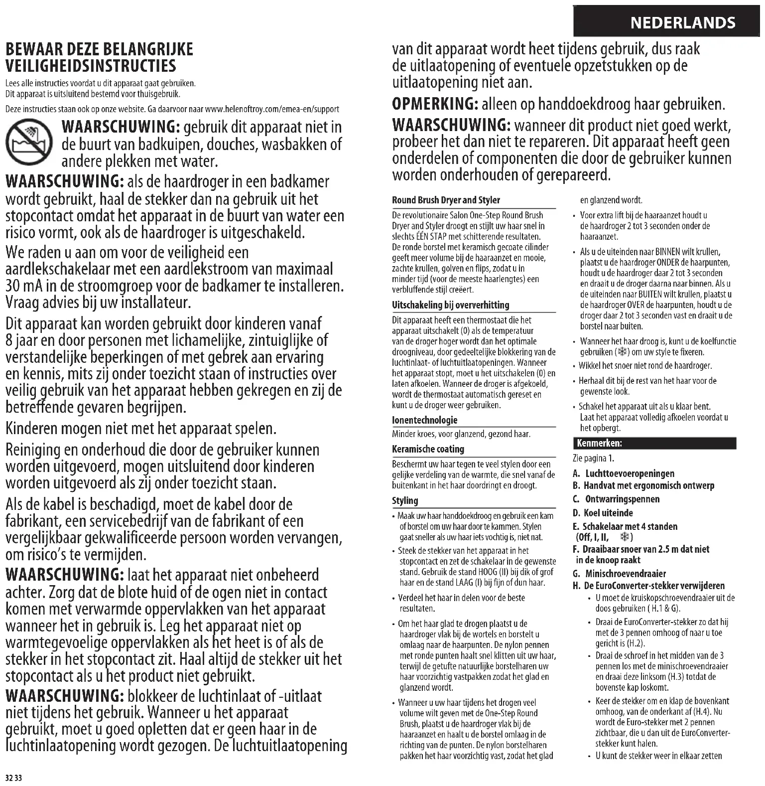 VEILIGHEIDSINSTRUCTIES Lees alle instructies voordat u dit apparaat gaat gebruiken. Dit apparaat is uitsluitend bestemd voor thuisgebruik. Deze instructies staan ook op onze website. Ga daarvoor naar www.helenoftroy.com/emea-en/support WAARSCHUWING: gebruik dit apparaat niet in de buurt van badkuipen, douches, wasbakken of andere plekken met water. WAARSCHUWING: als de haardroger in een badkamer wordt gebruikt, haal de stekker dan na gebruik uit het stopcontact omdat het apparaat in de buurt van water een risico vormt, ook als de haardroger is uitgeschakeld. We raden u aan om voor de veiligheid een aardlekschakelaar met een aardlekstroom van maximaal 30 mA in de stroomgroep voor de badkamer te installeren. Vraag advies bij uw installateur. Dit apparaat kan worden gebruikt door kinderen vanaf 8 jaar en door personen met lichamelijke, zintuiglijke of verstandelijke beperkingen of met gebrek aan ervaring en kennis, mits zij onder toezicht staan of instructies over veilig gebruik van het apparaat hebben gekregen en zij de betreffende gevaren begrijpen. Kinderen mogen niet met het apparaat spelen. Reiniging en onderhoud die door de gebruiker kunnen worden uitgevoerd, mogen uitsluitend door kinderen worden uitgevoerd als zij onder toezicht staan. Als de kabel is beschadigd, moet de kabel door de fabrikant, een servicebedrijf van de fabrikant of een vergelijkbaar gekwalificeerde persoon worden vervangen, om risico’s te vermijden. WAARSCHUWING: laat het apparaat niet onbeheerd achter. Zorg dat de blote huid of de ogen niet in contact komen met verwarmde oppervlakken van het apparaat wanneer het in gebruik is. Leg het apparaat niet op warmtegevoelige oppervlakken als het heet is of als de stekker in het stopcontact zit. Haal altijd de stekker uit het stopcontact als u het product niet gebruikt. WAARSCHUWING: blokkeer de luchtinlaat of -uitlaat niet tijdens het gebruik. Wanneer u het apparaat gebruikt, moet u goed opletten dat er geen haar in de luchtinlaatopening wordt gezogen. De luchtuitlaatopening van dit apparaat wordt heet tijdens gebruik, dus raak de uitlaatopening of eventuele opzetstukken op de uitlaatopening niet aan. OPMERKING: alleen op handdoekdroog haar gebruiken. WAARSCHUWING: wanneer dit product niet goed werkt, probeer het dan niet te repareren. Dit apparaat heeft geen onderdelen of componenten die door de gebruiker kunnen worden onderhouden of gerepareerd. NEDERLANDS Round Brush Dryer and Styler De revolutionaire Salon One-Step Round Brush Dryer and Styler droogt en stijlt uw haar snel in slechts ÉÉN STAP met schitterende resultaten. De ronde borstel met keramisch gecoate cilinder geeft meer volume bij de haaraanzet en mooie, zachte krullen, golven en flips, zodat u in minder tijd (voor de meeste haarlengtes) een verbluffende stijl creëert. Uitschakeling bij oververhitting Dit apparaat heeft een thermostaat die het apparaat uitschakelt (0) als de temperatuur van de droger hoger wordt dan het optimale droogniveau, door gedeeltelijke blokkering van de luchtinlaat- of luchtuitlaatopeningen. Wanneer het apparaat stopt, moet u het uitschakelen (0) en laten afkoelen. Wanneer de droger is afgekoeld, wordt de thermostaat automatisch gereset en kunt u de droger weer gebruiken. Ionentechnologie Minder kroes, voor glanzend, gezond haar. Keramische coating Beschermt uw haar tegen te veel stylen door een gelijke verdeling van de warmte, die snel vanaf de buitenkant in het haar doordringt en droogt. Styling