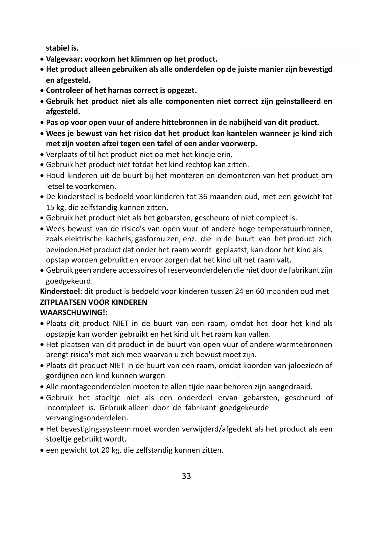 - Gebruik geen andere accessoires of reserveonderdelen die niet door de fabrikant zijn goedgekeurd. Kinderstoel: dit product is bedoeld voor kinderen tussen 24 en 60 maanden oud met