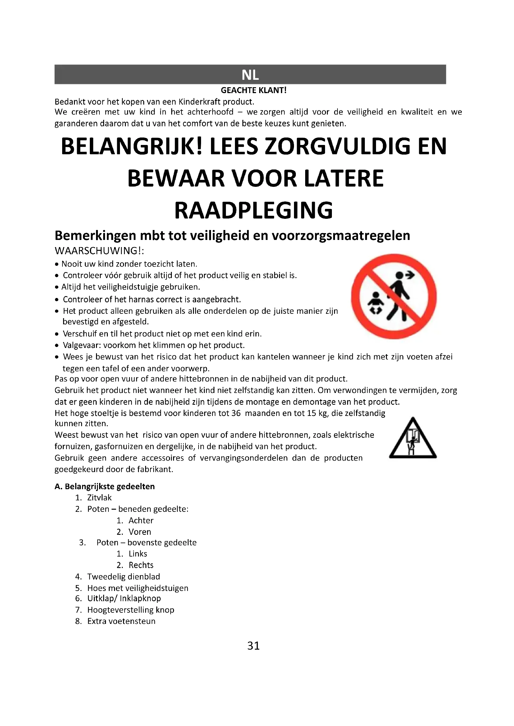 - Wees je bewust van het risico dat het product kan kantelen wanneer je kind zich met zijn voeten afzei tegen een tafel of een ander voorwerp. Pas op voor open vuur of andere hittebronnen in de nabijheid van dit product. Gebruik het product niet wanneer het kind niet zelfstandig kan zitten. Om verwondingen te vermijden, zorg dat er geen kinderen in de nabijheid zijn tijdens de montage en demontage van het product. Het hoge stoeltje is bestemd voor kinderen tot 36 maanden en tot 15 kg, die zelfstandig kunnen zitten. Weest bewust van het risico van open vuur of andere hittebronnen, zoals elektrische fornuizen, gasfornuizen en dergelijke, in de nabijheid van het product. Gebruik geen andere accessoires of vervangingsonderdelen dan de producten goedgekeurd door de fabrikant. A. Belangrijkste gedeelten 1. Zitvlak 2. Poten – beneden gedeelte: 1. Achter 2. Voren 3. Poten – bovenste gedeelte 1. Links 2. Rechts 4. Tweedelig dienblad 5. Hoes met veiligheidstuigen 6. Uitklap/ Inklapknop 7. Hoogteverstelling knop 8. Extra voetensteun NL32 B. Montage van poten Verwijder de plastieken dopjes voor de montage van de uiteinden van buizen. Druk op de knop (6) en klap de rechter en linker poot uit (3.1, 3.2). Plaats de linker poot van het stoeltje (3.1) in de opening op de zijkant van het zitvlak (1). Schuif de poot in totdat er cijfer „1” in het raampje op de zijkant verschijnt. Herhaal met de rechter poot (3.2). Als gevolg gaat u de constructie ontvangen zoals afgebeeld op B2. Bevestig de poot