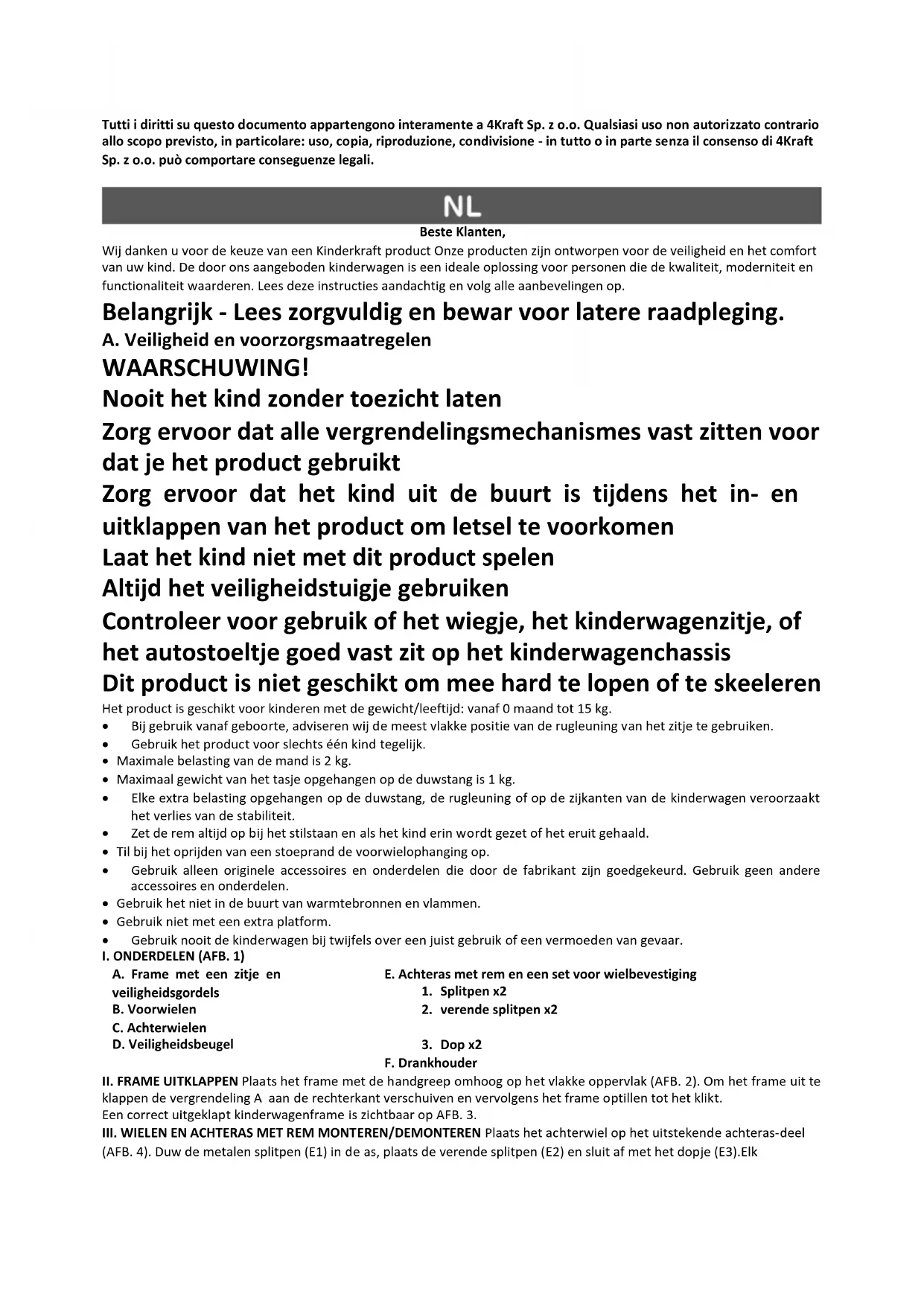 J. Danni derivanti dall’utilizzo di componenti o oggetti esterni – tra i quali: portabicchieri, ombrelli, elementi riflettenti,, campanelli; K. Danni causati dal trasporto o dallo staff dell'aereo. 8. Il periodo di garanzia, per gli accessori in dotazione al dispositivo, è di 6 mesi dalla data di acquisto, ad esclusione dei danneggiamenti di cui sopra. 9. Le presenti condizioni di garanzia costituiscono un supplemento ai diritti attribuiti dalla legge al Cliente nei confronti di 4KRAFT sp. z o.o.. La garanzia non esclude, limita o sospende i diritti del cliente derivanti dalle disposizioni relative alla garanzia sui difetti del prodotto venduto. 10. Il regolamento completo dei termini e delle condizioni della garanzia è disponibile sul sito WWW.KINDERKRAFT.COMTutti i diritti su questo documento appartengono interamente a 4Kraft Sp. z o.o. Qualsiasi uso non autorizzato contrario allo scopo previsto, in particolare: uso, copia, riproduzione, condivisione - in tutto o in parte senza il consenso di 4Kraft Sp. z o.o. può comportare conseguenze legali. Beste Klanten, Wij danken u voor de keuze van een Kinderkraft product Onze producten zijn ontworpen voor de veiligheid en het comfort van uw kind. De door ons aangeboden kinderwagen is een ideale oplossing voor personen die de kwaliteit, moderniteit en functionaliteit waarderen. Lees deze instructies aandachtig en volg alle aanbevelingen op. Belangrijk - Lees zorgvuldig en bewar voor latere raadpleging. A. Veiligheid en voorzorgsmaatregelen WAARSCHUWING! Nooit het kind zonder toezicht laten Zorg ervoor dat alle vergrendelingsmechanismes vast zitten voor dat je het product gebruikt Zorg ervoor dat het kind uit de buurt is tijdens het in- en uitklappen van het product om letsel te voorkomen Laat het kind niet met dit product spelen Altijd het veiligheidstuigje gebruiken Controleer voor gebruik of het wiegje, het kinderwagenzitje, of het autostoeltje goed vast zit op het kinderwagenchassis Dit product is niet geschikt om mee hard te lopen of te skeeleren Het product is geschikt voor kinderen met de gewicht/leeftijd: vanaf 0 maand tot 15 kg.