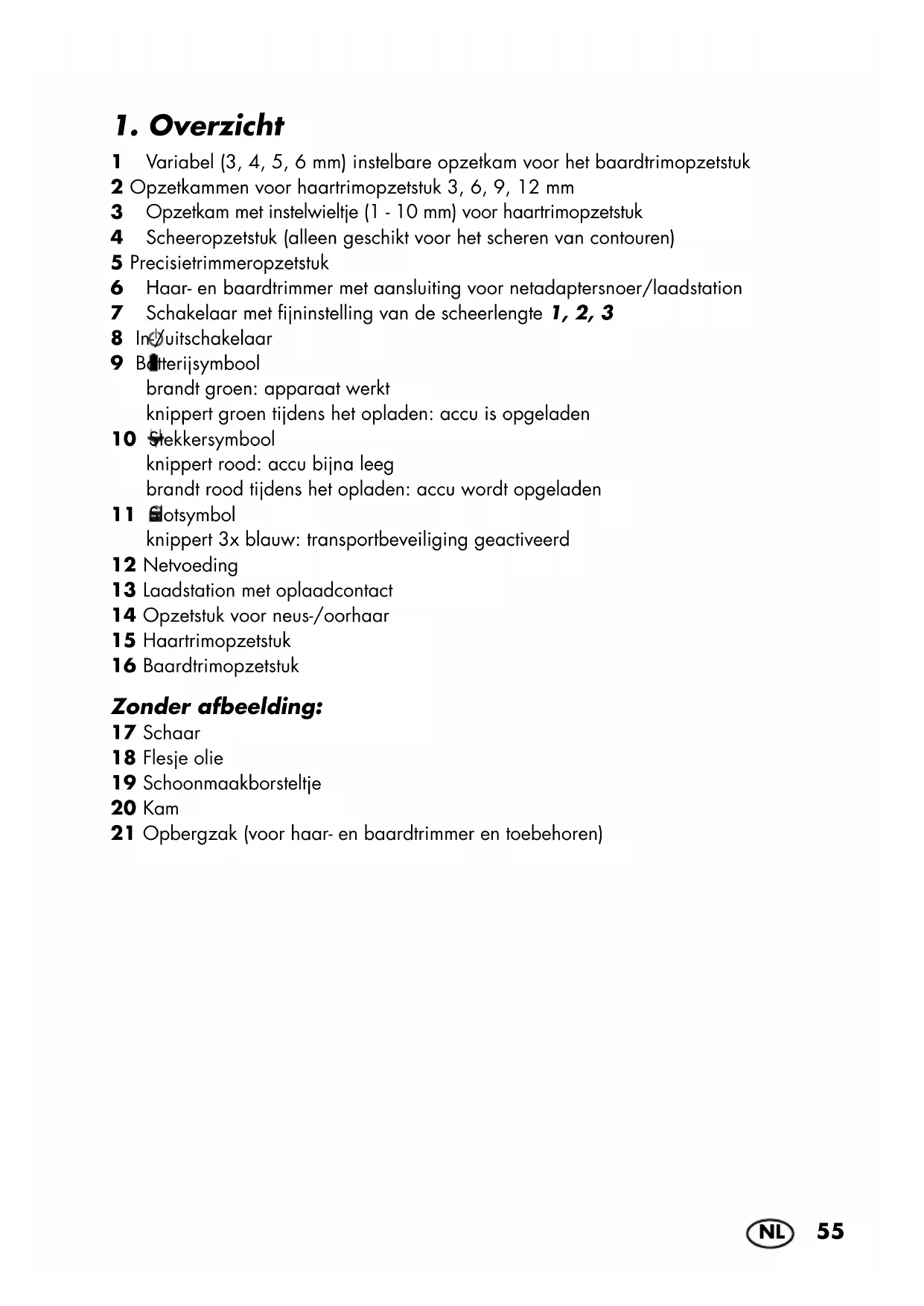 Opzetkam met instelwieltje (1 - 10 mm) voor haartrimopzetstuk 4 Scheeropzetstuk (alleen geschikt voor het scheren van contouren) 5 Precisietrimmeropzetstuk 6 Haar- en baardtrimmer met aansluiting voor netadaptersnoer/laadstation 7 Schakelaar met fijninstelling van de scheerlengte 1, 2, 3 8 In-/uitschakelaar 9 Batterijsymbool brandt groen: apparaat werkt knippert groen tijdens het opladen: accu is opgeladen 10 Stekkersymbool knippert rood: accu bijna leeg brandt rood tijdens het opladen: accu wordt opgeladen 11 Slotsymbol knippert 3x blauw: transportbeveiliging geactiveerd 12 Netvoeding 13 Laadstation met oplaadcontact 14 Opzetstuk voor neus-/oorhaar 15 Haartrimopzetstuk 16 Baardtrimopzetstuk Zonder afbeelding: 17 Schaar 18 Flesje olie 19 Schoonmaakborsteltje 20 Kam 21 Opbergzak (voor haar- en baardtrimmer en toebehoren) __384419_2107_B8.book Seite 55 Mittwoch, 17. November 2021 11:35 1156