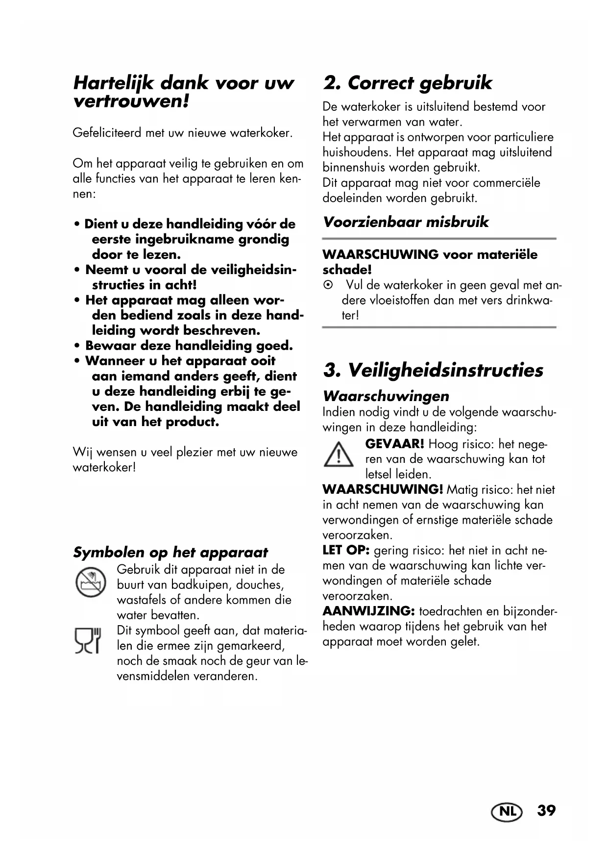 - Wanneer u het apparaat ooit aan iemand anders geeft, dient u deze handleiding erbij te ge- ven. De handleiding maakt deel uit van het product. Wij wensen u veel plezier met uw nieuwe waterkoker! Symbolen op het apparaat Gebruik dit apparaat niet in de buurt van badkuipen, douches, wastafels of andere kommen die water bevatten. Dit symbool geeft aan, dat materia- len die ermee zijn gemarkeerd, noch de smaak noch de geur van le- vensmiddelen veranderen.