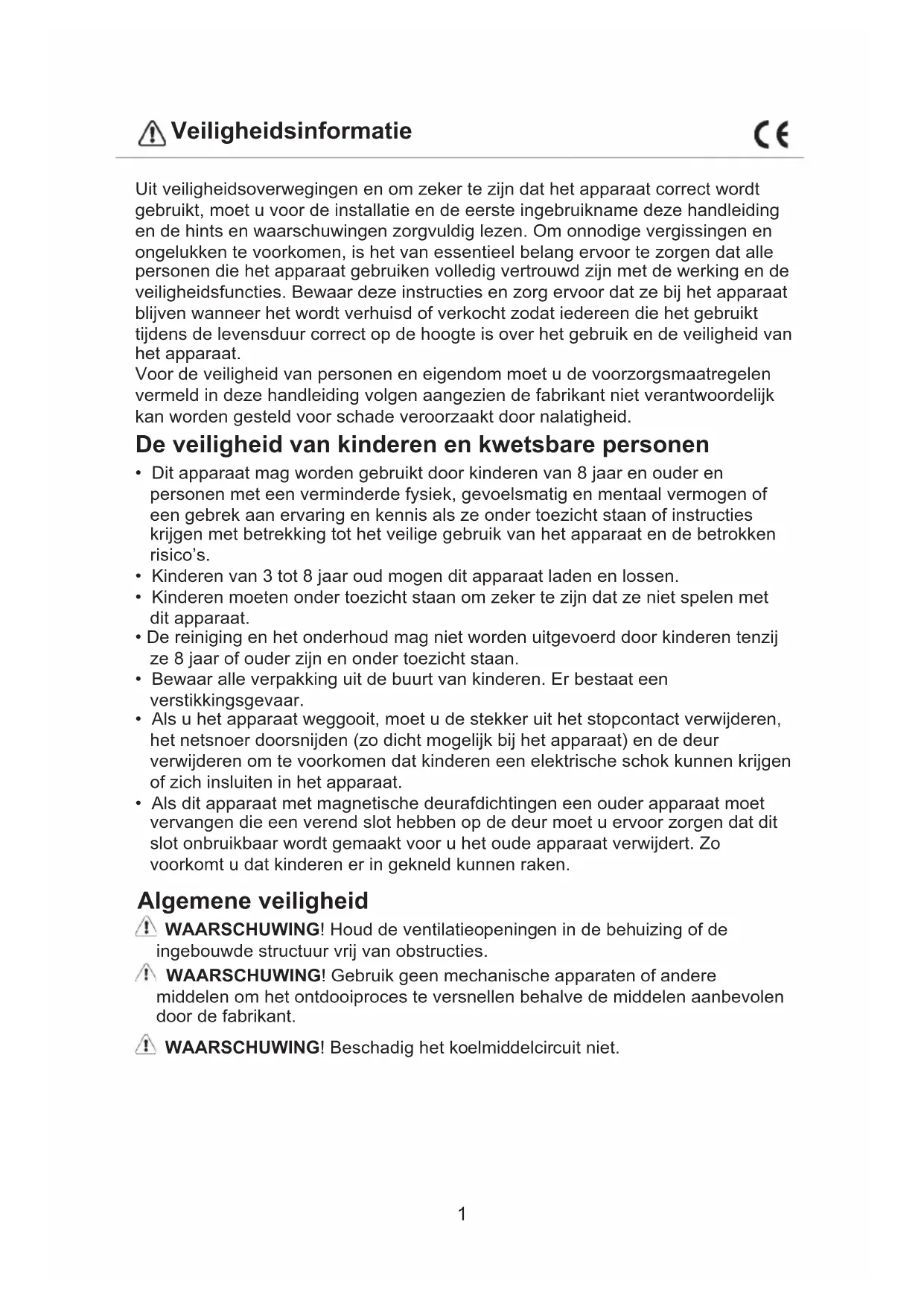 - Als dit apparaat met magnetische deurafdichtingen een ouder apparaat moet vervangen die een verend slot hebben op de deur moet u ervoor zorgen dat dit slot onbruikbaar wordt gemaakt voor u het oude apparaat verwijdert. Zo voorkomt u dat kinderen er in gekneld kunnen raken. Algemene veiligheid WAARSCHUWING! Houd de ventilatieopeningen in de behuizing of de ingebouwde structuur vrij van obstructies. WAARSCHUWING! Gebruik geen mechanische apparaten of andere middelen om het ontdooiproces te versnellen behalve de middelen aanbevolen door de fabrikant. WAARSCHUWING! Beschadig het koelmiddelcircuit niet. 1Veiligheidsinformatie WAARSCHUWING! Gebruik geen andere apparaten (zoals roomijsmachines) in koelapparaten, tenzij ze zijn goedgekeurd voor dit doeleinde door de fabrikant. WAARSCHUWING! Raak de lamp niet aan als ze gedurende een lange periode is ingeschakeld omdat ze heel warm kan zijn.