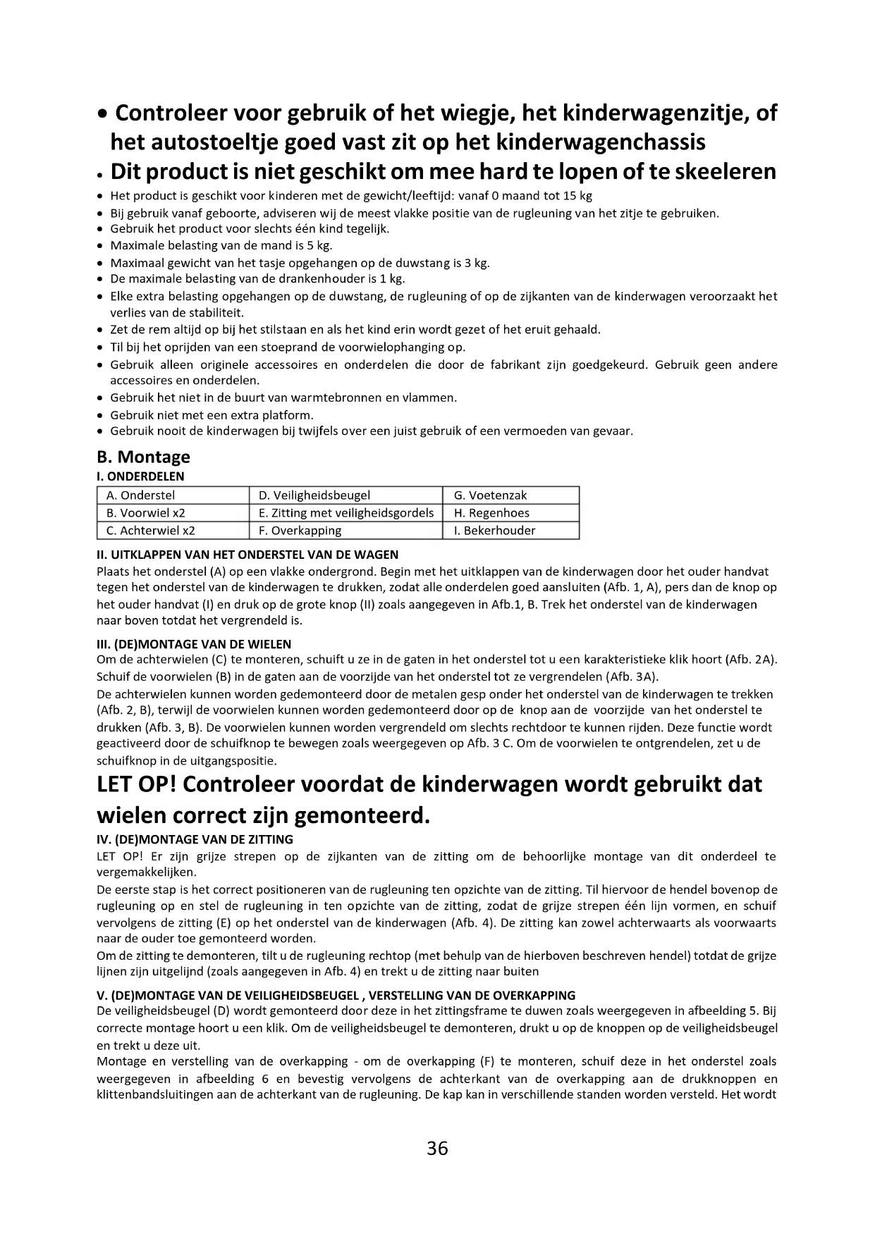 - Gebruik nooit de kinderwagen bij twijfels over een juist gebruik of een vermoeden van gevaar. B. Montage