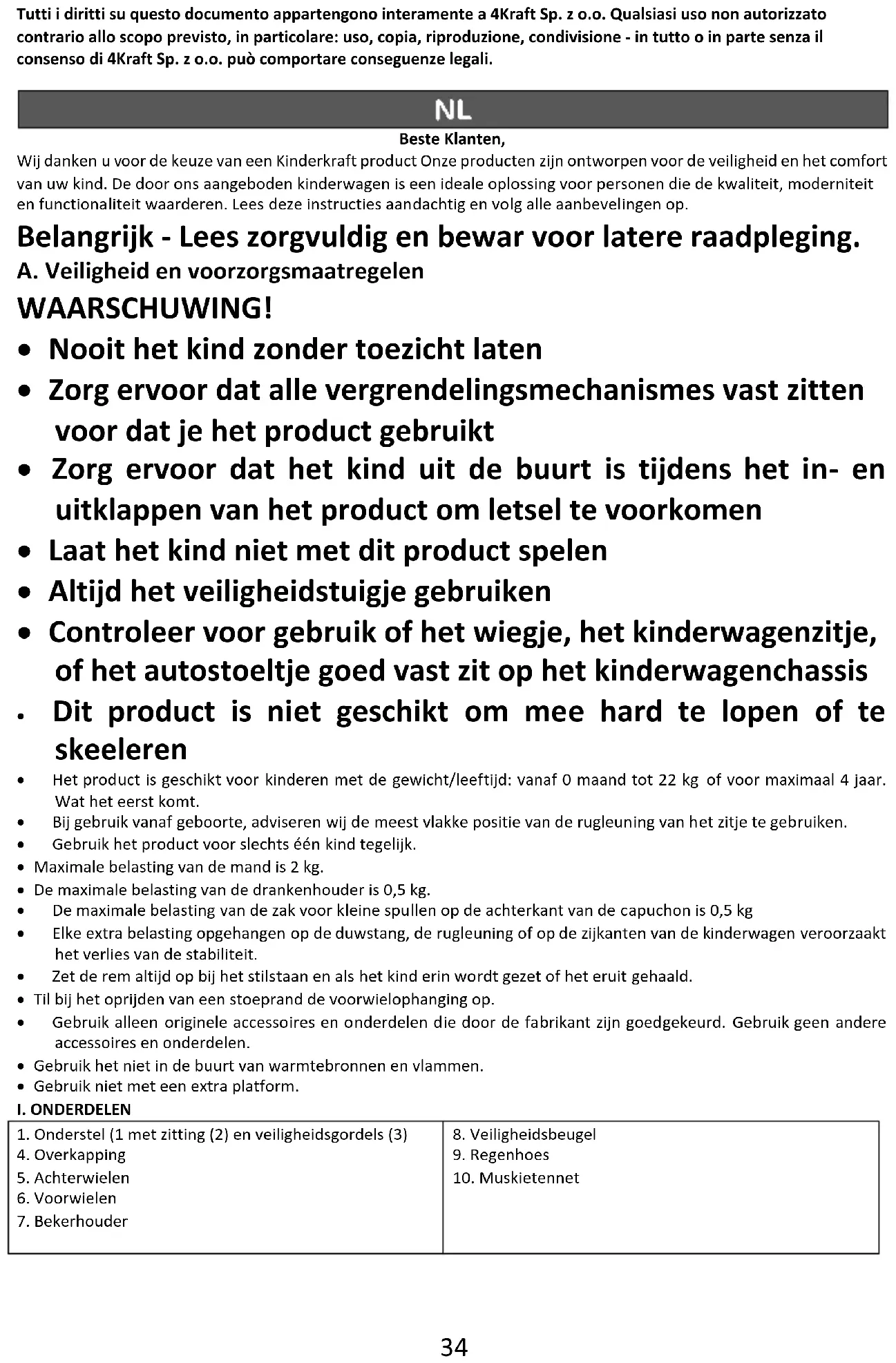 Tutti i diritti su questo documento appartengono interamente a 4Kraft Sp. z o.o. Qualsiasi uso non autorizzato contrario allo scopo previsto, in particolare: uso, copia, riproduzione, condivisione - in tutto o in parte senza il consenso di 4Kraft Sp. z o.o. può comportare conseguenze legali. Beste Klanten, Wij danken u voor de keuze van een Kinderkraft product Onze producten zijn ontworpen voor de veiligheid en het comfort van uw kind. De door ons aangeboden kinderwagen is een ideale oplossing voor personen die de kwaliteit, moderniteit en functionaliteit waarderen. Lees deze instructies aandachtig en volg alle aanbevelingen op. Belangrijk - Lees zorgvuldig en bewar voor latere raadpleging. A. Veiligheid en voorzorgsmaatregelen WAARSCHUWING!