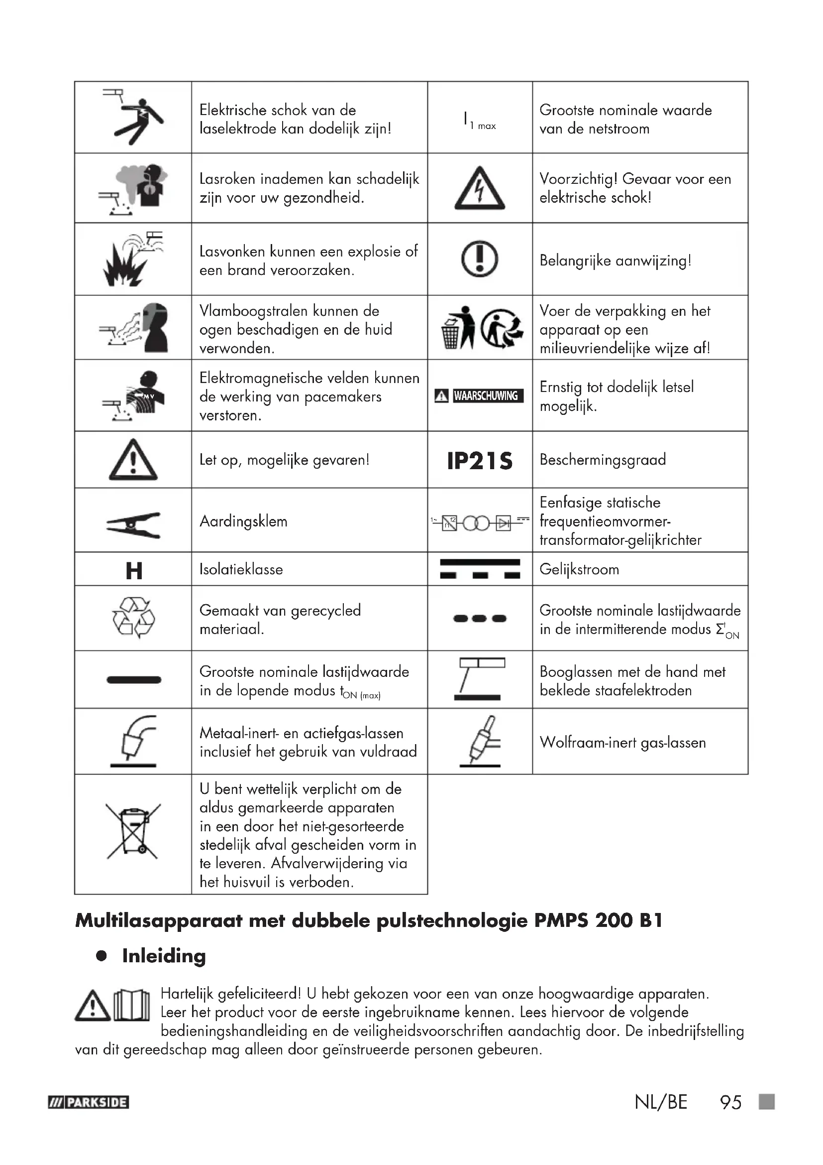 Grootste nominale lastijdwaarde in de lopende modus t ON (max) Booglassen met de hand met beklede staafelektroden Metaal-inert- en actiefgas-lassen inclusief het gebruik van vuldraad Wolfraam-inert gas-lassen U bent wettelijk verplicht om de aldus gemarkeerde apparaten in een door het niet-gesorteerde stedelijk afval gescheiden vorm in te leveren. Afvalverwijdering via het huisvuil is verboden. Multilasapparaat met dubbele pulstechnologie PMPS 200 B1 z Inleiding Hartelijk gefeliciteerd! U hebt gekozen voor een van onze hoogwaardige apparaten. Leer het product voor de eerste ingebruikname kennen. Lees hiervoor de volgende bedieningshandleiding en de veiligheidsvoorschriften aandachtig door. De inbedrijfstelling van dit gereedschap mag alleen door geïnstrueerde personen gebeuren.96 NL/BE BUITEN HET BEREIK VAN KINDEREN HOUDEN! z Gebruik conform de voorschriften Het apparaat is bestemd voor het lassen met massieve draad (MIG en MAG), MMA-lassen (lassen met staafelektroden), TIG-lassen (wolfraam-inert gas-lassen) evenals voor het lassen met gevulde draad. Bij het gebruik van gevulde draden die geen beschermgas in vaste vorm bevatten, moet bovendien beschermgas worden gebruikt. Bij gebruik van zelfbeschermende gevulde draad is geen aanvullend gas nodig. Het beschermgas bevindt zich in dat geval in poedervorm in de lasdraad en wordt daardoor direct de vlamboog in geleid. Daardoor is het apparaat bij werken in de openlucht ongevoelig voor wind. Alleen draadelektroden die geschikt zijn voor het apparaat, mogen worden gebruikt. Dit lasapparaat is geschikt voor het vlambooglassen met de hand van staal (MMA-lassen), roestvrij staal, plaatstaal en gegoten materialen met behulp van de bijbehorende beklede elektroden. Neem hiervoor de gegevens van de elektrodefabrikant in acht. Alleen elektroden die geschikt zijn voor het apparaat, mogen worden gebruikt. Neem bij wolfraam-inert gas-lassen (TIG-lassen) beslist de gebruiksaanwijzing en de veiligheidsinstructies van de gebruikte TIG-toorts in acht naast de aanwijzingen en veiligheids- instructies in deze gebruiksaanwijzing. Een ondeskundige hantering van het product kan gevaarlijk zijn voor personen, dieren en goederen. Gebruik het product alleen zoals is beschreven en voor de vermelde toepassingen. Bewaar deze handleiding goed. Overhandig ook alle documentatie bij de overdracht van het product aan derden. Elk gebruik dat afwijkt van het gebruik conform de voorschriften, is verboden en mogelijk gevaarlijk. Schade door niet-inachtneming of verkeerd gebruik wordt niet door de garantie gedekt en valt niet onder de aansprakelijkheid van de producent. Bij commercieel gebruik vervalt de garantie. Bestanddeel van het gebruik conform de voorschriften is ook de inachtneming van de veiligheidsaanwijzingen en van de montagehandleiding en van de gebruiksaanwijzingen in de bedieningshandleiding. De geldende ongevallenpreventievoorschriften moeten uiterst nauwgezet worden gerespecteerd. Het apparaat mag niet worden gebruikt: in ruimtes die niet voldoende zijn geventileerd; in een explosiegevaarlijke omgeving; om buizen te ontdooien; in de buurt van mensen met een pacemaker; en in de buurt van licht ontvlambare materialen. Resterend risico Ook wanneer u het apparaat volgens de voorschriften gebruikt, blijven er altijd resterende risico's bestaan. De volgende gevaren kunnen zich voordoen door de constructie en uitvoering van dit MIG-puls-lasapparaat: oogletsel door verblinding, aanraken hete onderdelen van het apparaat of van het werkstuk (brandwonden); bij ondeskundige beveiliging tegen ongevallen en brandgevaar door vliegende vonken of slakdeeltjes; schadelijke emissies van rook en gassen, bij gebrek aan lucht resp. onvoldoende afzuiging in gesloten ruimtes. AANWIJZING: Verminder het resterende risico door het apparaat zorgvuldig en volgens de voorschriften te gebruiken en alle aanwijzingen op te volgen. z Leveringsomvang 1 multilasapparaat met dubbele pulstechnologie PMPS 200 B1 1 MIG-lastoorts met 2 m-laskabel 1 hoogwaardige, gegalvaniseerde, koperen aardingsklem A-vorm met 2 m-kabel 1 elektrodehouder MMA met 2 m-laskabel 4 stroommondstukken voor staaldraad/gevulde draad (1x 0,6 mm; 1x 0,8 mm; 1x 0,9 mm; 1x 1,0 mm) Identificatie overeenkomstig diameter: 0,6; 0,8; 0,9; 1,0NL/BE