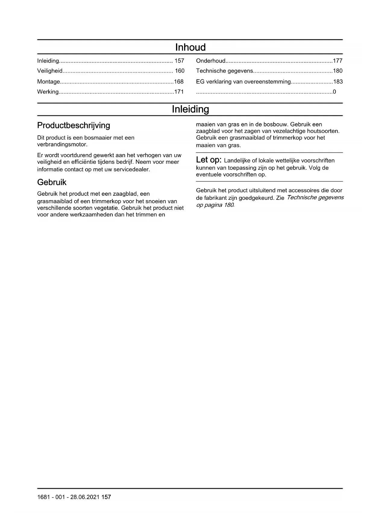 Inleiding Productbeschrijving Dit product is een bosmaaier met een verbrandingsmotor. Er wordt voortdurend gewerkt aan het verhogen van uw veiligheid en efficiëntie tijdens bedrijf. Neem voor meer informatie contact op met uw servicedealer. Gebruik Gebruik het product met een zaagblad, een grasmaaiblad of een trimmerkop voor het snoeien van verschillende soorten vegetatie. Gebruik het product niet voor andere werkzaamheden dan het trimmen en maaien van gras en in de bosbouw. Gebruik een zaagblad voor het zagen van vezelachtige houtsoorten. Gebruik een grasmaaiblad of trimmerkop voor het maaien van gras. Let op: Landelijke of lokale wettelijke voorschriften kunnen van toepassing zijn op het gebruik. Volg de eventuele voorschriften op. Gebruik het product uitsluitend met accessoires die door de fabrikant zijn goedgekeurd. Zie Technische gegevens op pagina 180