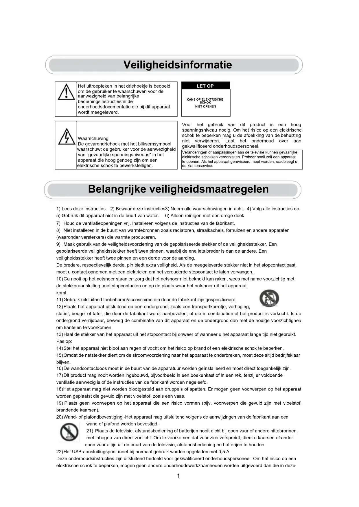 1. Alleen kasten of steunen te gebruiken die worden aanbevolen door de fabrikant van de televisie.