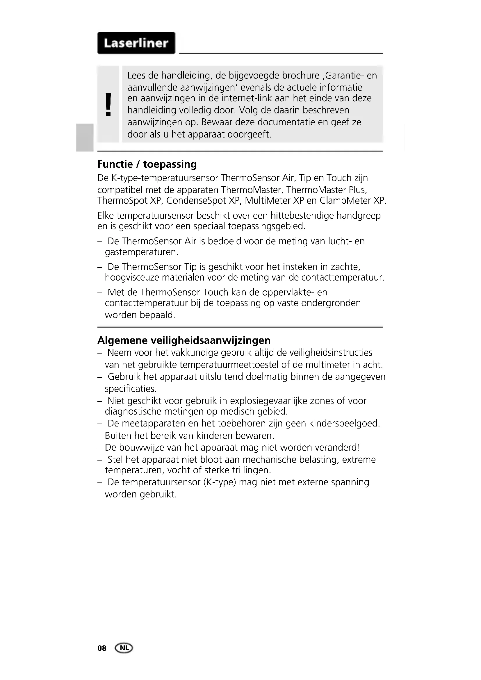 - °C) ± 0.75% (333°C °C) Operating conditions -10°C … 60°C, Max. humidity 80% rH, no condensation, Max. working altitude 4000 m above sea level Storage conditions -20°C … 70°C, Max. humidity 80% rH Cable length 40 … 120 cm Sensor Air 165 mm Sensor Tip 185 mm Sensor Touch 115 mm Dimensions (W x H x D) Air 22 x 295 x 22 mm (without cable) Dimensions (W x H x D) Tip 22 x 315 x 22 mm (without cable) Dimensions (W x H x D) Touch 22 x 245 x 22 mm (without cable) Weight Air 106 g Weight Tip 104 g Weight Touch 96 g EN08 De K-type-temperatuursensor ThermoSensor Air, Tip en Touch zijn compatibel met de apparaten ThermoMaster, ThermoMaster Plus, ThermoSpot XP, CondenseSpot XP, MultiMeter XP en ClampMeter XP. Elke temperatuursensor beschikt over een hittebestendige handgreep en is geschikt voor een speciaal toepassingsgebied. – De ThermoSensor Air is bedoeld voor de meting van lucht- en gastemperaturen. – De ThermoSensor Tip is geschikt voor het insteken in zachte, hoogvisceuze materialen voor de meting van de contacttemperatuur. – Met de ThermoSensor Touch kan de oppervlakte- en contacttemperatuur bij de toepassing op vaste ondergronden worden bepaald. – Neem voor het vakkundige gebruik altijd de veiligheidsinstructies van het gebruikte temperatuurmeettoestel of de multimeter in acht. – Gebruik het apparaat uitsluitend doelmatig binnen de aangegeven specicaties. – Niet geschikt voor gebruik in explosiegevaarlijke zones of voor diagnostische metingen op medisch gebied. – De meetapparaten en het toebehoren zijn geen kinderspeelgoed. Buiten het bereik van kinderen bewaren. – De bouwwijze van het apparaat mag niet worden veranderd! – Stel het apparaat niet bloot aan mechanische belasting, extreme temperaturen, vocht of sterke trillingen. – De temperatuursensor (K-type) mag niet met externe spanning worden gebruikt. Algemene veiligheidsaanwijzingen Functie / toepassing Lees de handleiding, de bijgevoegde brochure ‚Garantie- en aanvullende aanwijzingen‘ evenals de actuele informatie en aanwijzingen in de internet-link aan het einde van deze handleiding volledig door. Volg de daarin beschreven aanwijzingen op. Bewaar deze documentatie en geef ze door als u het apparaat doorgeeft. p. 400