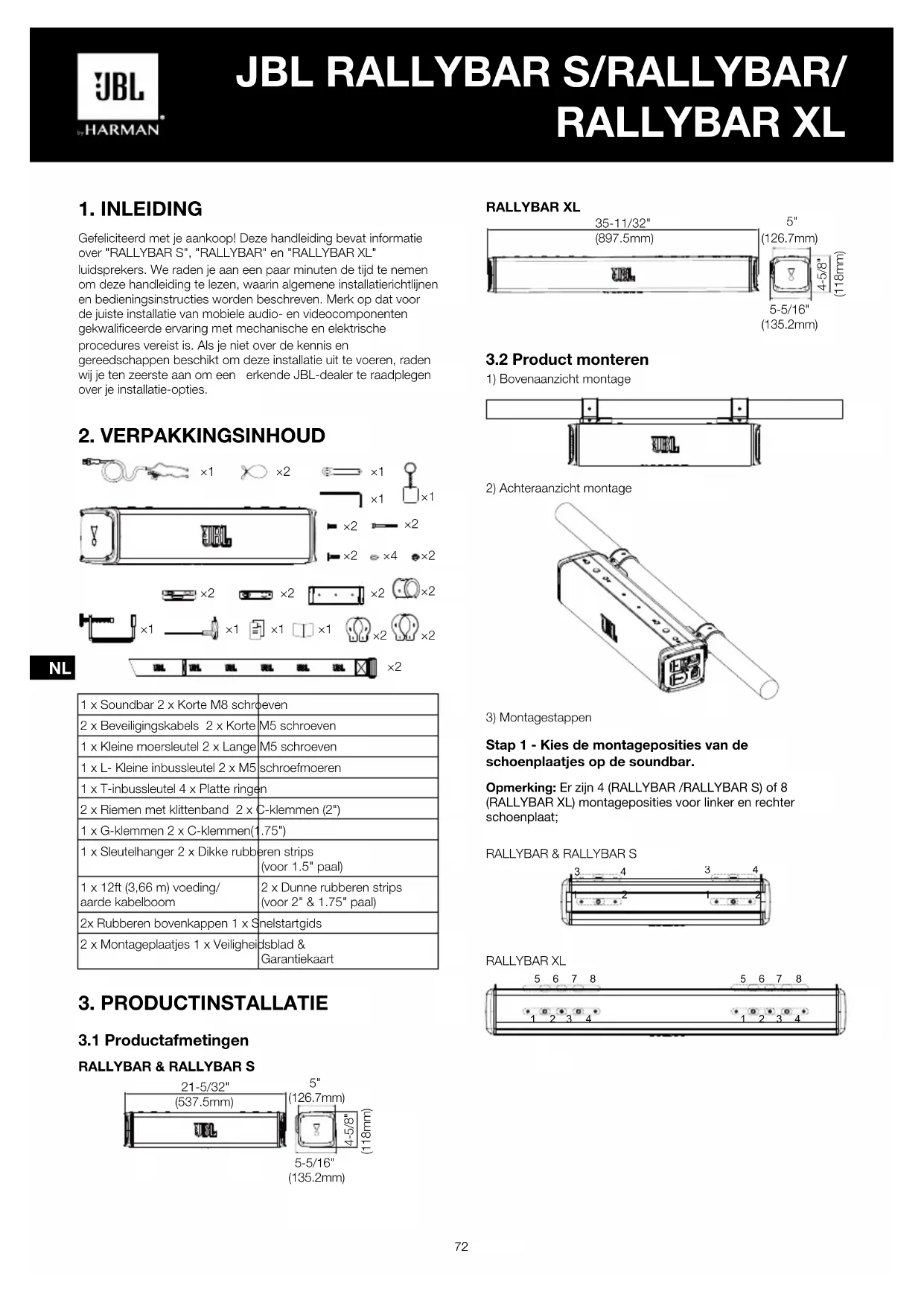 Gefeliciteerd met je aankoop! Deze handleiding bevat informatie over "RALLYBAR S", "RALLYBAR" en "RALLYBAR XL" luidsprekers. We raden je aan een paar minuten de tijd te nemen om deze handleiding te lezen, waarin algemene installatierichtlijnen en bedieningsinstructies worden beschreven. Merk op dat voor de juiste installatie van mobiele audio- en videocomponenten gekwalificeerde ervaring met mechanische en elektrische procedures vereist is. Als je niet over de kennis en gereedschappen beschikt om deze installatie uit te voeren, raden wij je ten zeerste aan om een erkende JBL-dealer te raadplegen over je installatie-opties.