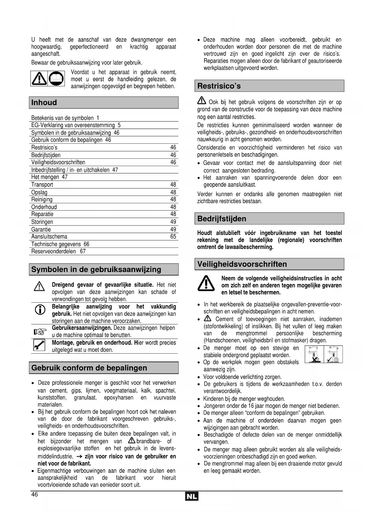 Garanti Vennligst ta hensyn til den vedlagte garantierklæringen.46 U heeft met de aanschaf van deze dwangmenger een hoogwaardig, geperfectioneerd en krachtig apparaat aangeschaft. Bewaar de gebruiksaanwijzing voor later gebruik. Voordat u het apparaat in gebruik neemt, moet u eerst de handleiding gelezen, de aanwijzingen opgevolgd en begrepen hebben. Inhoud Betekenis van de symbolen 1 EG-Verklaring van overeenstemming 5 Symbolen in de gebruiksaanwijzing 46 Gebruik conform de bepalingen 46 Restrisico’s 46 Bedrijfstijden 46 Veiligheidsvoorschriften 46 Inbedrijfstelling / in- en uitchakelen 47 Het mengen 47 Transport 48 Opslag 48 Reiniging 48 Onderhoud 48 Reparatie 48 Storingen 49 Garantie 49 Aansluitschema 65 Technische gegevens 66 Reserveonderdelen 67 Symbolen in de gebruiksaanwijzing