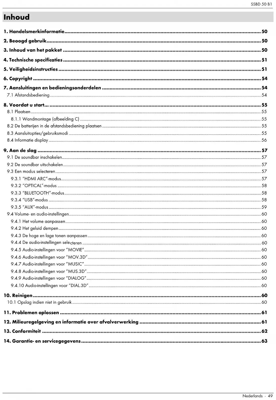 Als u de soundbar gedurende een langere periode niet gebruikt, bewaart u deze op een schone en droge plaats. Verwijder ook de batterijen uit de afstandsbediening om lekkage te voorkomen.SSBD 50 B1 Nederlands - 61