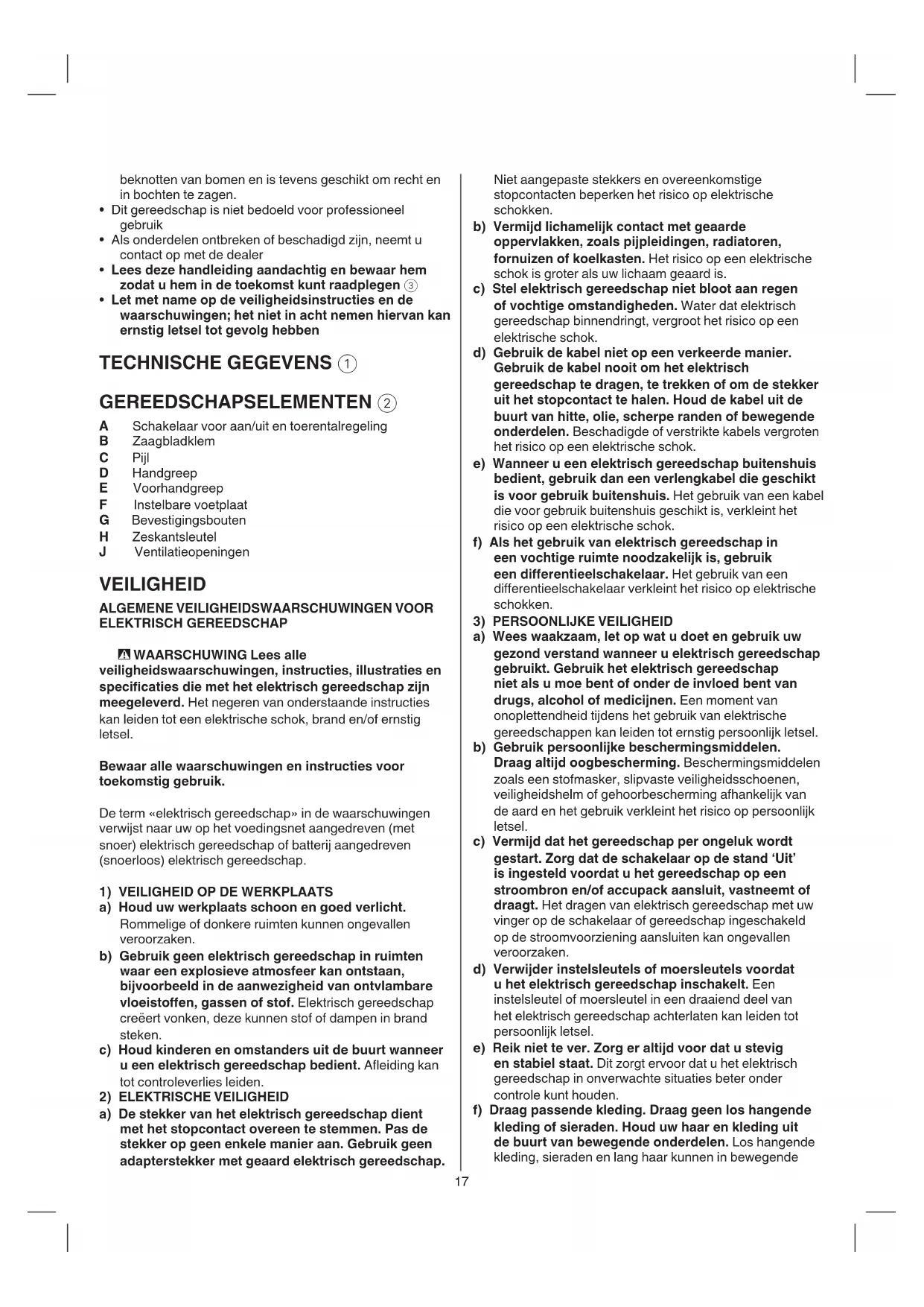 - Let met name op de veiligheidsinstructies en de waarschuwingen; het niet in acht nemen hiervan kan ernstig letsel tot gevolg hebben TECHNISCHE GEGEVENS 1 GEREEDSCHAPSELEMENTEN 2 A Schakelaar voor aan/uit en toerentalregeling B Zaagbladklem C Pijl D Handgreep E Voorhandgreep F Instelbare voetplaat G Bevestigingsbouten H Zeskantsleutel J Ventilatieopeningen VEILIGHEID