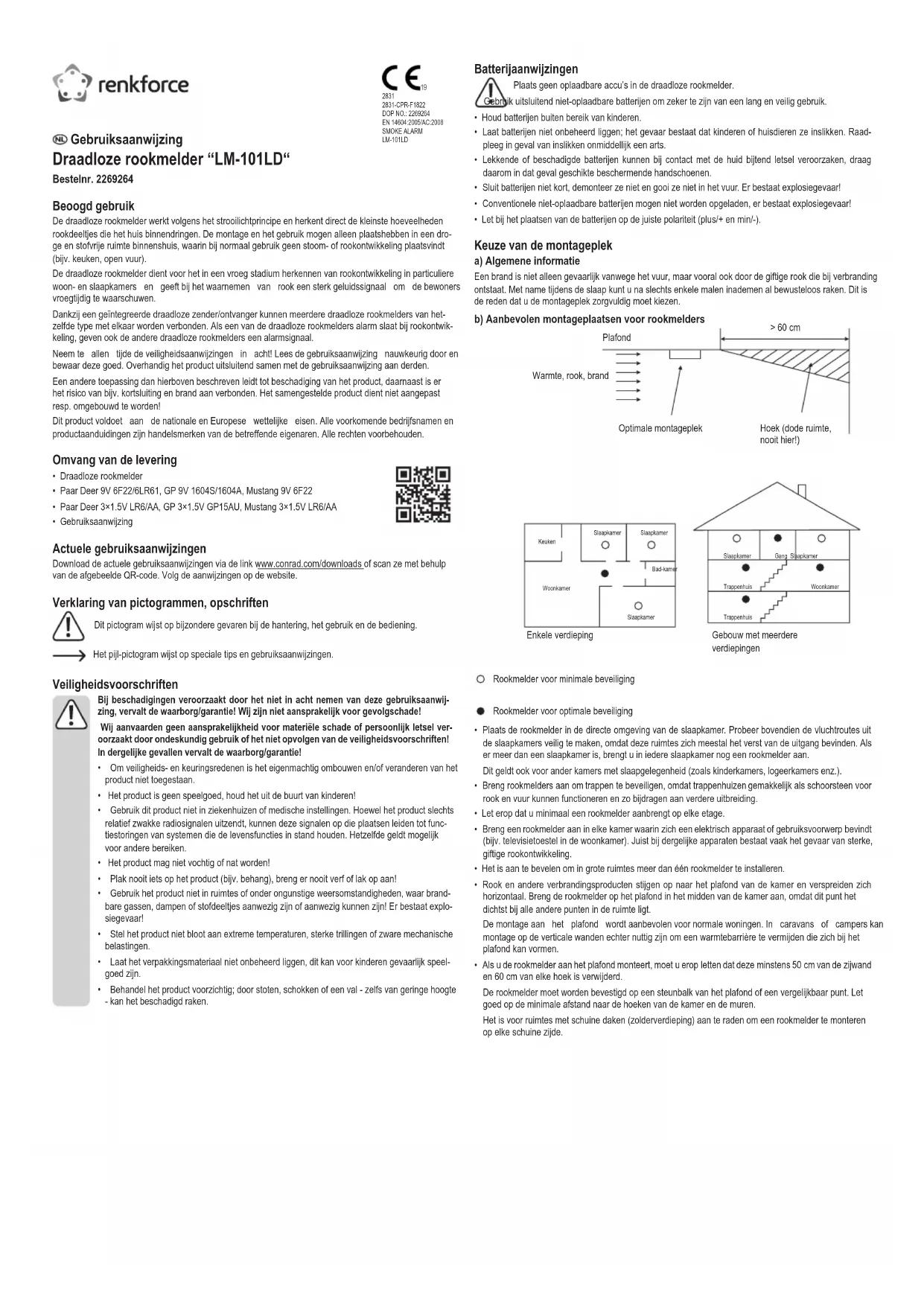 - Alsuderookmelderaanhetplafondmonteert,moetueroplettendatdezeminstens50cmvandezijwand en60cmvanelkehoekisverwijderd. Derookmeldermoetwordenbevestigdopeensteunbalkvanhetplafondofeenvergelijkbaarpunt.Let goedopdeminimaleafstandnaardehoekenvandekamerendemuren. Hetisvoorruimtesmetschuinedaken(zolderverdieping)aanteradenomeenrookmeldertemonteren opelkeschuinezijde. SlaapkamerKeukenSlaapkamerSlaapkamerTrappenhuisTrappenhuisGang SlaapkamerWoonkamerSlaapkamerBad-kamerWoonkamer Warmte,rook,brand Plafond Optimalemontageplek Enkeleverdieping Rookmeldervoorminimalebeveiliging Rookmeldervooroptimalebeveiliging Gebouwmetmeerdere verdiepingen Hoek(doderuimte, nooithier!) >60cm Gebruiksaanwijzing Draadloze rookmelder “LM-101LD“ Bestelnr. 2269264 Beoogd gebruik Dedraadlozerookmelderwerktvolgenshetstrooilichtprincipeenherkentdirectdekleinstehoeveelheden rookdeeltjesdiehethuisbinnendringen.Demontageenhetgebruikmogenalleenplaatshebbenineendro- geenstofvrijeruimtebinnenshuis,waarinbijnormaalgebruikgeenstoom-ofrookontwikkelingplaatsvindt (bijv.keuken,openvuur). Dedraadlozerookmelderdientvoorhetineenvroegstadiumherkennenvanrookontwikkelinginparticuliere woon-enslaapkamers en geeftbijhetwaarnemen van rookeensterkgeluidssignaal om debewoners vroegtijdigtewaarschuwen. Dankzijeengeïntegreerdedraadlozezender/ontvangerkunnenmeerderedraadlozerookmeldersvanhet- zelfdetypemetelkaarwordenverbonden.Alseenvandedraadlozerookmeldersalarmslaatbijrookontwik- keling,gevenookdeanderedraadlozerookmelderseenalarmsignaal. Neemte allen tijdedeveiligheidsaanwijzingen in acht!Leesdegebruiksaanwijzing nauwkeurigdooren bewaardezegoed.Overhandighetproductuitsluitendsamenmetdegebruiksaanwijzingaanderden. Eenanderetoepassingdanhierbovenbeschrevenleidttotbeschadigingvanhetproduct,daarnaastiser hetrisicovanbijv.kortsluitingenbrandaanverbonden.Hetsamengesteldeproductdientnietaangepast resp.omgebouwdteworden! Ditproductvoldoet aan denationaleenEuropese wettelijke eisen.Allevoorkomendebedrijfsnamenen productaanduidingenzijnhandelsmerkenvandebetreffendeeigenaren.Allerechtenvoorbehouden. Omvang van de levering