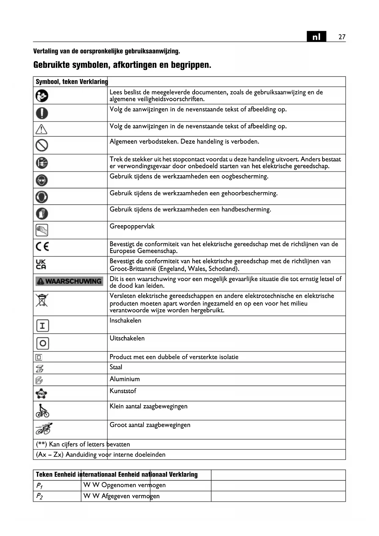 Vertaling van de oorspronkelijke gebruiksaanwijzing. Gebruikte symbolen, afkortingen en begrippen. Symbool, teken Verklaring Lees beslist de meegeleverde documenten, zoals de gebruiksaanwijzing en de algemene veiligheidsvoorschriften. Volg de aanwijzingen in de nevenstaande tekst of afbeelding op. Volg de aanwijzingen in de nevenstaande tekst of afbeelding op. Algemeen verbodsteken. Deze handeling is verboden. Trek de stekker uit het stopcontact voordat u deze handeling uitvoert. Anders bestaat er verwondingsgevaar door onbedoeld starten van het elektrische gereedschap. Gebruik tijdens de werkzaamheden een oogbescherming. Gebruik tijdens de werkzaamheden een gehoorbescherming. Gebruik tijdens de werkzaamheden een handbescherming. Greepoppervlak Bevestigt de conformiteit van het elektrische gereedschap met de richtlijnen van de Europese Gemeenschap. Bevestigt de conformiteit van het elektrische gereedschap met de richtlijnen van Groot-Brittannië (Engeland, Wales, Schotland). Dit is een waarschuwing voor een mogelijk gevaarlijke situatie die tot ernstig letsel of de dood kan leiden. Versleten elektrische gereedschappen en andere elektrotechnische en elektrische producten moeten apart worden ingezameld en op een voor het milieu verantwoorde wijze worden hergebruikt. Inschakelen Uitschakelen Product met een dubbele of versterkte isolatie Staal Aluminium Kunststof Klein aantal zaagbewegingen Groot aantal zaagbewegingen (**) Kan cijfers of letters bevatten (Ax – Zx) Aanduiding voor interne doeleinden Teken Eenheid internationaal Eenheid nationaal Verklaring