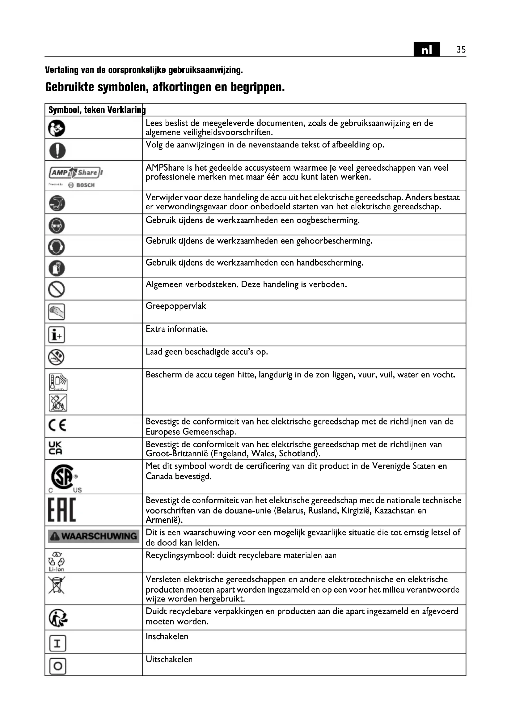 Vertaling van de oorspronkelijke gebruiksaanwijzing. Gebruikte symbolen, afkortingen en begrippen. Symbool, teken Verklaring Lees beslist de meegeleverde documenten, zoals de gebruiksaanwijzing en de algemene veiligheidsvoorschriften. Volg de aanwijzingen in de nevenstaande tekst of afbeelding op. AMPShare is het gedeelde accusysteem waarmee je veel gereedschappen van veel professionele merken met maar één accu kunt laten werken. Verwijder voor deze handeling de accu uit het elektrische gereedschap. Anders bestaat er verwondingsgevaar door onbedoeld starten van het elektrische gereedschap. Gebruik tijdens de werkzaamheden een oogbescherming. Gebruik tijdens de werkzaamheden een gehoorbescherming. Gebruik tijdens de werkzaamheden een handbescherming. Algemeen verbodsteken. Deze handeling is verboden. Greepoppervlak Extra informatie. Laad geen beschadigde accu’s op. Bescherm de accu tegen hitte, langdurig in de zon liggen, vuur, vuil, water en vocht. Bevestigt de conformiteit van het elektrische gereedschap met de richtlijnen van de Europese Gemeenschap. Bevestigt de conformiteit van het elektrische gereedschap met de richtlijnen van Groot-Brittannië (Engeland, Wales, Schotland). Met dit symbool wordt de certificering van dit product in de Verenigde Staten en Canada bevestigd. Bevestigt de conformiteit van het elektrische gereedschap met de nationale technische voorschriften van de douane-unie (Belarus, Rusland, Kirgizië, Kazachstan en Armenië). Dit is een waarschuwing voor een mogelijk gevaarlijke situatie die tot ernstig letsel of de dood kan leiden. Recyclingsymbool: duidt recyclebare materialen aan Versleten elektrische gereedschappen en andere elektrotechnische en elektrische producten moeten apart worden ingezameld en op een voor het milieu verantwoorde wijze worden hergebruikt. Duidt recyclebare verpakkingen en producten aan die apart ingezameld en afgevoerd moeten worden. Inschakelen Uitschakelen max.50°C36