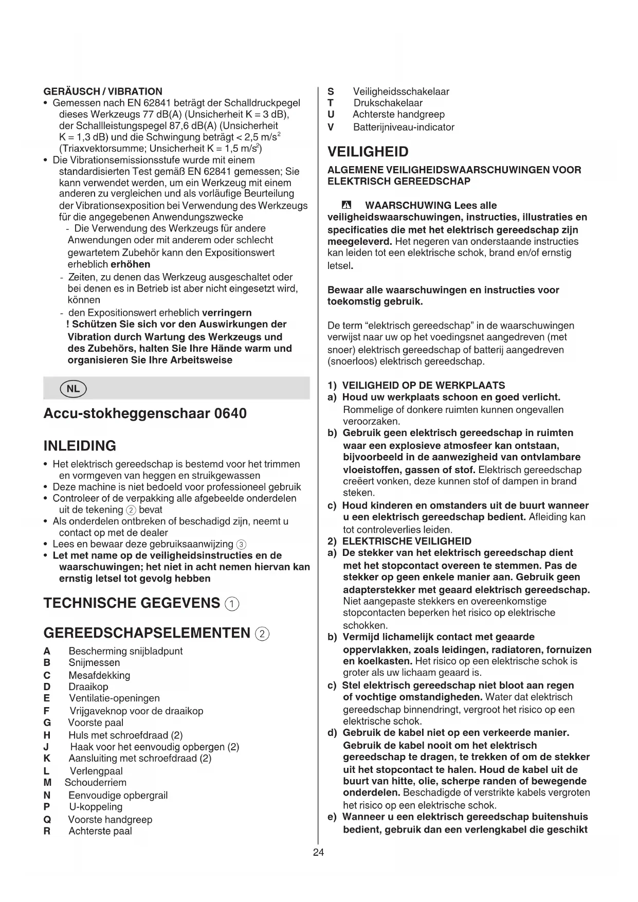 P U-koppeling Q Voorste handgreep R Achterste paal25 Elektrisch gereedschap dat niet kan worden in- of uitgeschakeld is gevaarlijk en moet worden gerepareerd. c) Trek de stekker uit de stroomvoorziening en/of verwijder het accupack, indien deze kan worden verwijderd, uit het elektrisch gereedschap voordat u het instelt, accessoires vervangt of het gereedschap opbergt. Deze preventieve voorzorgsmaatregelen beperken het risico op onbedoeld starten van het elektrisch gereedschap. d) Berg niet-gebruikt elektrisch gereedschap op buiten het bereik van kinderen en zorg ervoor dat personen die niet vertrouwd zijn met het gereedschap of die deze instructies niet hebben gelezen het gereedschap niet gebruiken.Elektrisch gereedschap is gevaarlijk wanneer het door onervaren personen wordt gebruikt. e) Onderhoud het elektrisch gereedschap en de accessoires. Controleer of de bewegende onderdelen correct functioneren en niet vastklemmen en of de onderdelen zodanig gebroken of beschadigd zijn dat de werking van het elektrisch gereedschap nadelig wordt beïnvloedt. Laat een beschadigd elektrisch gereedschap eerst repareren voordat u het weer in gebruik neemt. Vele ongevallen zijn het gevolg van slecht onderhouden elektrisch gereedschap. f) Houd de snij-onderdelen scherp en schoon. Zorgvuldig onderhouden snij-gereedschap met scherpe snijranden klemt minder snel vast en is gemakkelijker te beheersen. g) Gebruik het elektrisch gereedschap, accessoires, inzetgereedschap, etc. in overeenstemming met deze instructies en houd hierbij rekening met de werkomstandigheden en de uit te voeren werkzaamheden. Het gebruik van elektrisch gereedschap voor andere dan de beoogde toepassingen kan tot gevaarlijke situaties leiden. h) Houd de handgrepen en greepvlakken droog, schoon en vrij van olie en smeervet. Glibberige handgrepen en greepvlakken maken een veilige omgang en de controle over het elektrisch gereedschap in onverwachte situaties onmogelijk.