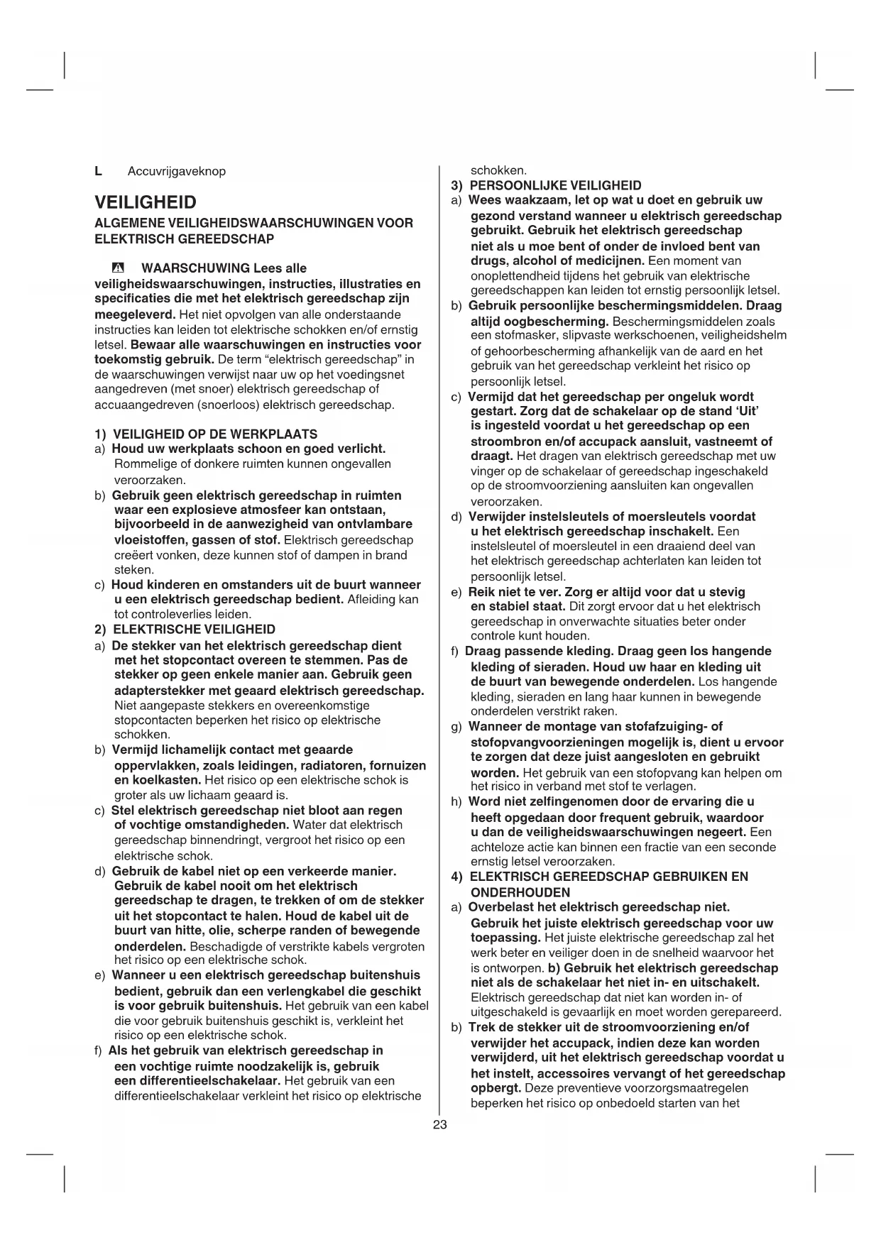 ONDERHOUDEN a) Overbelast het elektrisch gereedschap niet. Gebruik het juiste elektrisch gereedschap voor uw toepassing. Het juiste elektrische gereedschap zal het werk beter en veiliger doen in de snelheid waarvoor het is ontworpen. b) Gebruik het elektrisch gereedschap niet als de schakelaar het niet in- en uitschakelt. Elektrisch gereedschap dat niet kan worden in- of uitgeschakeld is gevaarlijk en moet worden gerepareerd. b) Trek de stekker uit de stroomvoorziening en/of verwijder het accupack, indien deze kan worden verwijderd, uit het elektrisch gereedschap voordat u het instelt, accessoires vervangt of het gereedschap opbergt. Deze preventieve voorzorgsmaatregelen beperken het risico op onbedoeld starten van het L Accuvrijgaveknop VEILIGHEID