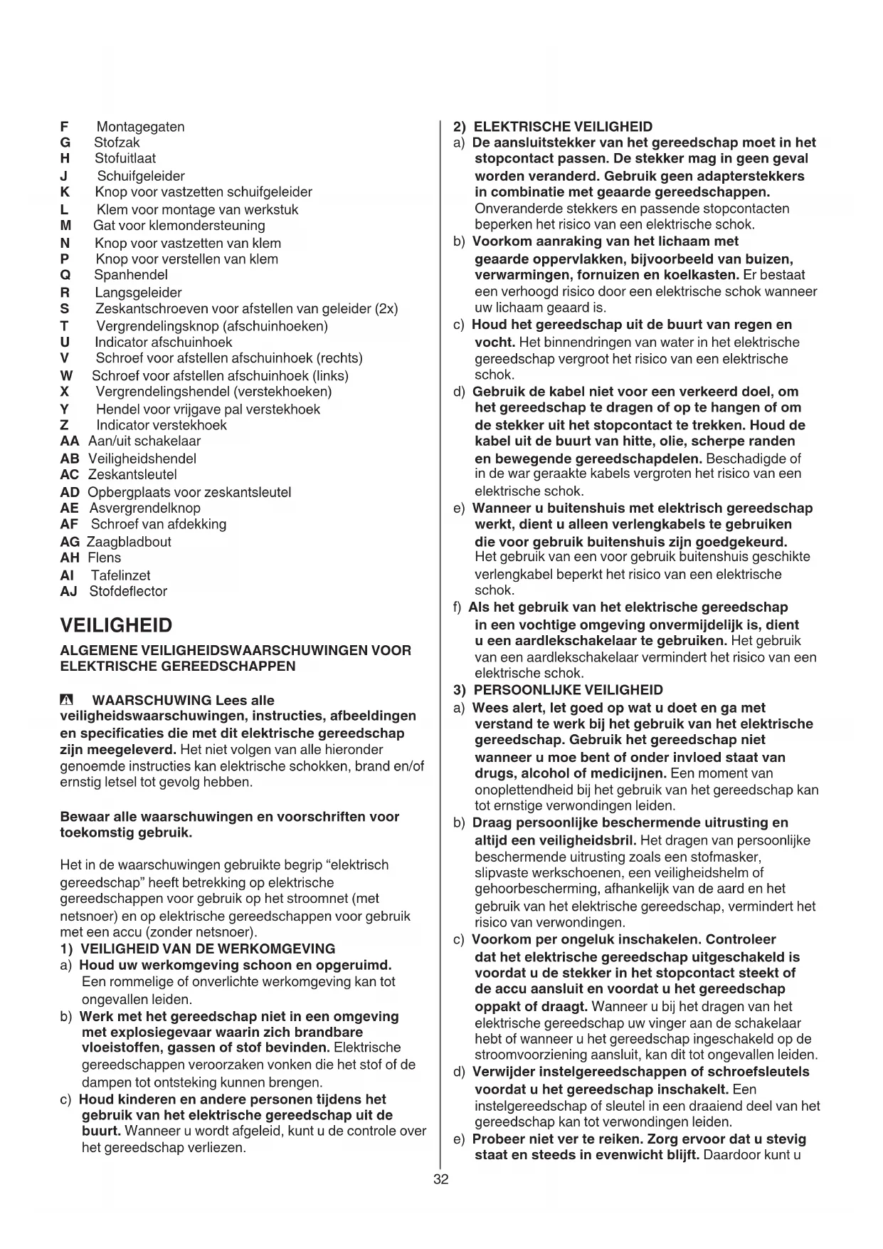 a) Wees alert, let goed op wat u doet en ga met verstand te werk bij het gebruik van het elektrische gereedschap. Gebruik het gereedschap niet wanneer u moe bent of onder invloed staat van drugs, alcohol of medicijnen. Een moment van onoplettendheid bij het gebruik van het gereedschap kan tot ernstige verwondingen leiden. b) Draag persoonlijke beschermende uitrusting en altijd een veiligheidsbril. Het dragen van persoonlijke beschermende uitrusting zoals een stofmasker, slipvaste werkschoenen, een veiligheidshelm of gehoorbescherming, afhankelijk van de aard en het gebruik van het elektrische gereedschap, vermindert het risico van verwondingen. c) Voorkom per ongeluk inschakelen. Controleer dat het elektrische gereedschap uitgeschakeld is voordat u de stekker in het stopcontact steekt of de accu aansluit en voordat u het gereedschap oppakt of draagt. Wanneer u bij het dragen van het elektrische gereedschap uw vinger aan de schakelaar hebt of wanneer u het gereedschap ingeschakeld op de stroomvoorziening aansluit, kan dit tot ongevallen leiden. d) Verwijder instelgereedschappen of schroefsleutels voordat u het gereedschap inschakelt. Een instelgereedschap of sleutel in een draaiend deel van het gereedschap kan tot verwondingen leiden. e) Probeer niet ver te reiken. Zorg ervoor dat u stevig staat en steeds in evenwicht blijft. Daardoor kunt u F Montagegaten G Stofzak H Stofuitlaat J Schuifgeleider K Knop voor vastzetten schuifgeleider L Klem voor montage van werkstuk M Gat voor klemondersteuning N Knop voor vastzetten van klem P Knop voor verstellen van klem Q Spanhendel R Langsgeleider S Zeskantschroeven voor afstellen van geleider (2x) T Vergrendelingsknop (afschuinhoeken) U Indicator afschuinhoek V Schroef voor afstellen afschuinhoek (rechts) W Schroef voor afstellen afschuinhoek (links) X Vergrendelingshendel (verstekhoeken) Y Hendel voor vrijgave pal verstekhoek Z Indicator verstekhoek AA Aan/uit schakelaar AB Veiligheidshendel AC Zeskantsleutel AD Opbergplaats voor zeskantsleutel AE Asvergrendelknop AF Schroef van afdekking AG Zaagbladbout AH Flens AI Tafelinzet AJ Stofdeector VEILIGHEID