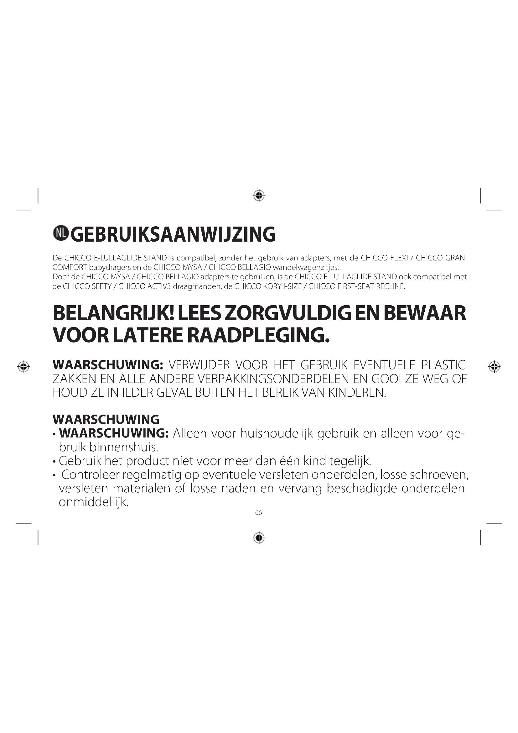 - Als het product niet gebruikt wordt, dient hij buiten het bereik van kinderen te worden gehouden. Gebruik met draagmand op de CHICCO E-LULLAGLIDE STAND:68