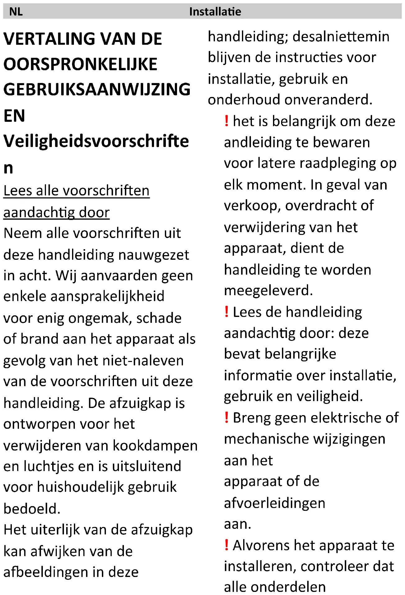 Lees alle voorschriften aandachtig door Neem alle voorschriften uit deze handleiding nauwgezet in acht. Wij aanvaarden geen enkele aansprakelijkheid voor enig ongemak, schade of brand aan het apparaat als gevolg van het niet-naleven van de voorschriften uit deze handleiding. De afzuigkap is ontworpen voor het verwijderen van kookdampen en luchtjes en is uitsluitend voor huishoudelijk gebruik bedoeld. Het uiterlijk van de afzuigkap kan afwijken van de afbeeldingen in deze handleiding; desalniettemin blijven de instructies voor installatie, gebruik en onderhoud onveranderd. ! het is belangrijk om deze andleiding te bewaren voor latere raadpleging op elk moment. In geval van verkoop, overdracht of verwijdering van het apparaat, dient de handleiding te worden meegeleverd. ! Lees de handleiding aandachtig door: deze bevat belangrijke informatie over installatie, gebruik en veiligheid. ! Breng geen elektrische of mechanische wijzigingen aan het apparaat of de afvoerleidingen aan. ! Alvorens het apparaat te installeren, controleer dat alle onderdelenNL