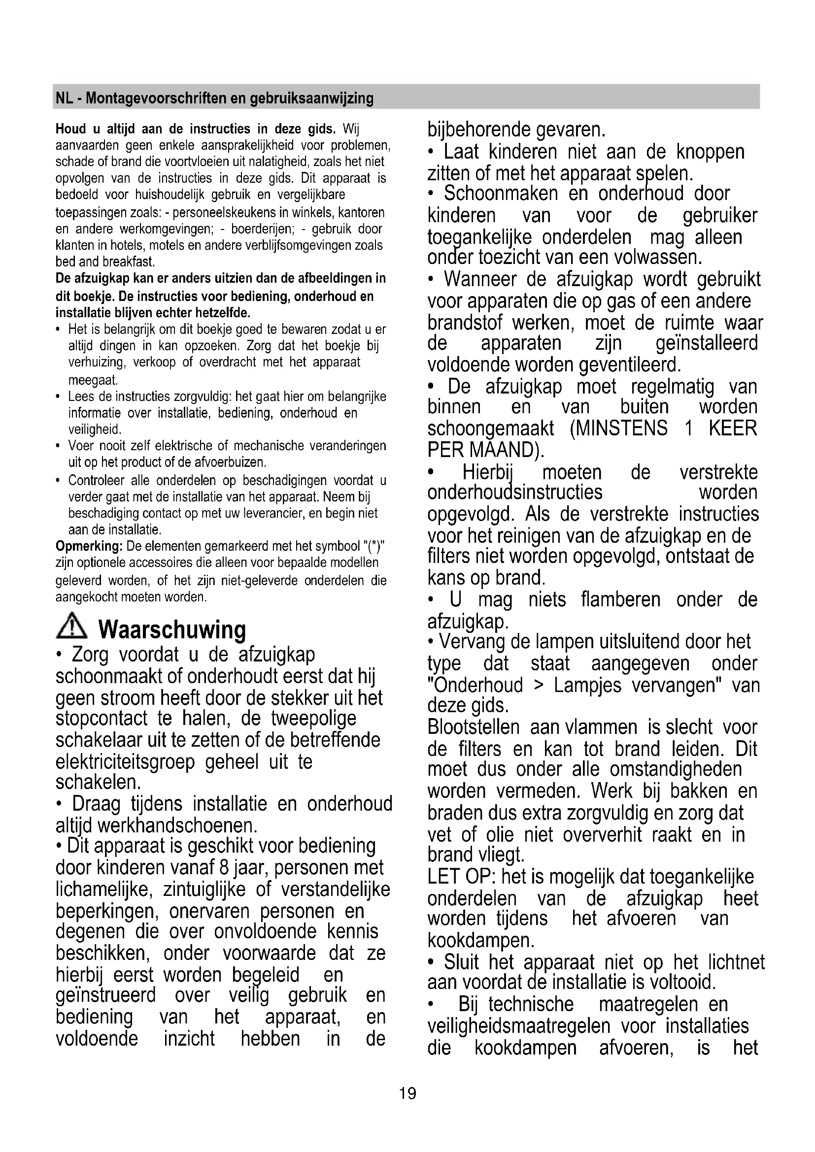 UNIQUEMENT sur certains produits : Un Clapet Anti-Retour des Fumées est fourni comme accessoire en option, à installer. Si les conditions d’installation le requièrent (par ex. : absence de protections contre le retour accidentel de courants d’air de l’extérieur), l’insérer dans le logement dédié du Raccord de Sortie d’Air avant d’installer le conduit d’échappement des fumées. Fig. 1519 NL - Montagevoorschriften en gebruiksaanwijzing Houd u altijd aan de instructies in deze gids. Wij aanvaarden geen enkele aansprakelijkheid voor problemen, schade of brand die voortvloeien uit nalatigheid, zoals het niet opvolgen van de instructies in deze gids. Dit apparaat is bedoeld voor huishoudelijk gebruik en vergelijkbare toepassingen zoals: - personeelskeukens in winkels, kantoren en andere werkomgevingen; - boerderijen; - gebruik door klanten in hotels, motels en andere verblijfsomgevingen zoals bed and breakfast. De afzuigkap kan er anders uitzien dan de afbeeldingen in dit boekje. De instructies voor bediening, onderhoud en installatie blijven echter hetzelfde.