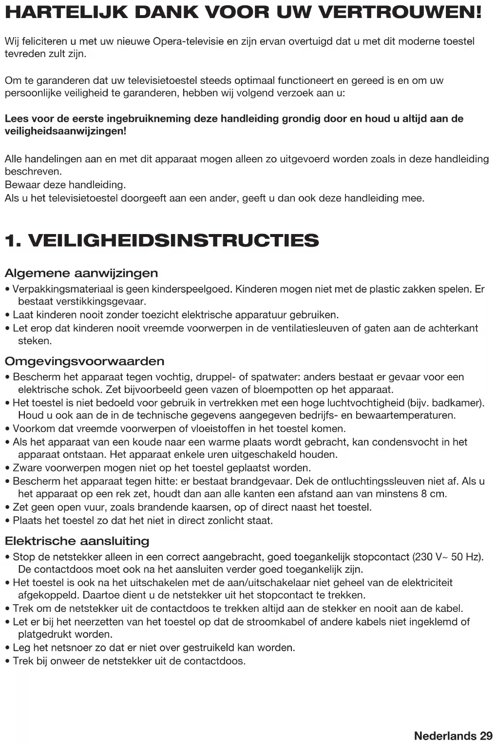 - 18. Garantievoorwaarden TV 3760.book Page 28 Monday, September 4, 2006 5:30 PMNederlands 29 HARTELIJK DANK VOOR UW VERTROUWEN! Wij feliciteren u met uw nieuwe Opera-televisie en zijn ervan overtuigd dat u met dit moderne toestel tevreden zult zijn. Om te garanderen dat uw televisietoestel steeds optimaal functioneert en gereed is en om uw persoonlijke veiligheid te garanderen, hebben wij volgend verzoek aan u: Lees voor de eerste ingebruikneming deze handleiding grondig door en houd u altijd aan de veiligheidsaanwijzingen! Alle handelingen aan en met dit apparaat mogen alleen zo uitgevoerd worden zoals in deze handleiding beschreven. Bewaar deze handleiding. Als u het televisietoestel doorgeeft aan een ander, geeft u dan ook deze handleiding mee. p. 50