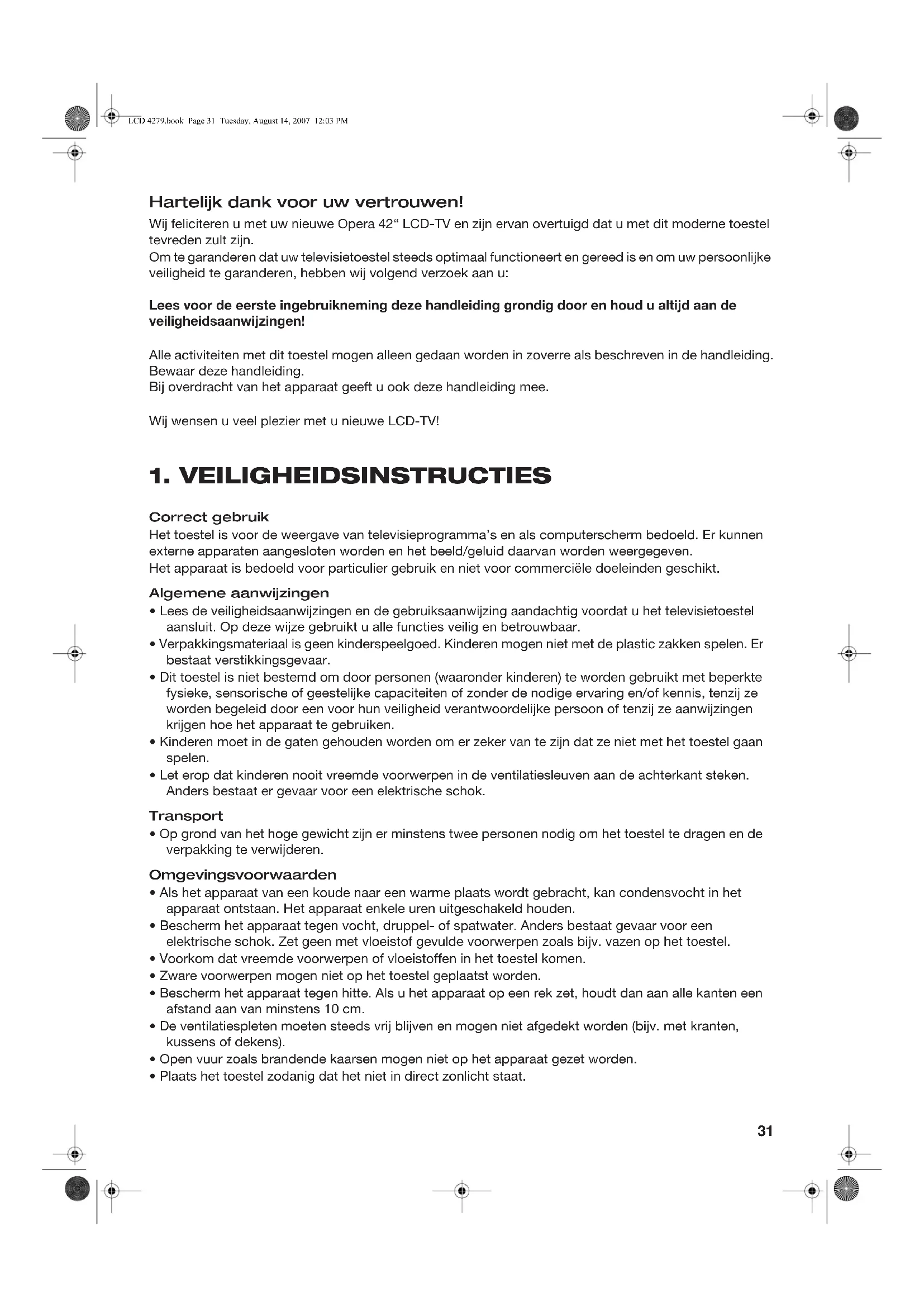 - 16. Garantievoorwaarden LCD 4279.book Page 30 Tuesday, August 14, 2007 12:03 PM31 Hartelijk dank voor uw vertrouwen! Wij feliciteren u met uw nieuwe Opera 42“ LCD-TV en zijn ervan overtuigd dat u met dit moderne toestel tevreden zult zijn. Om te garanderen dat uw televisietoestel steeds optimaal functioneert en gereed is en om uw persoonlijke veiligheid te garanderen, hebben wij volgend verzoek aan u: Lees voor de eerste ingebruikneming deze handleiding grondig door en houd u altijd aan de veiligheidsaanwijzingen! Alle activiteiten met dit toestel mogen alleen gedaan worden in zoverre als beschreven in de handleiding. Bewaar deze handleiding. Bij overdracht van het apparaat geeft u ook deze handleiding mee. Wij wensen u veel plezier met u nieuwe LCD-TV! p. 55