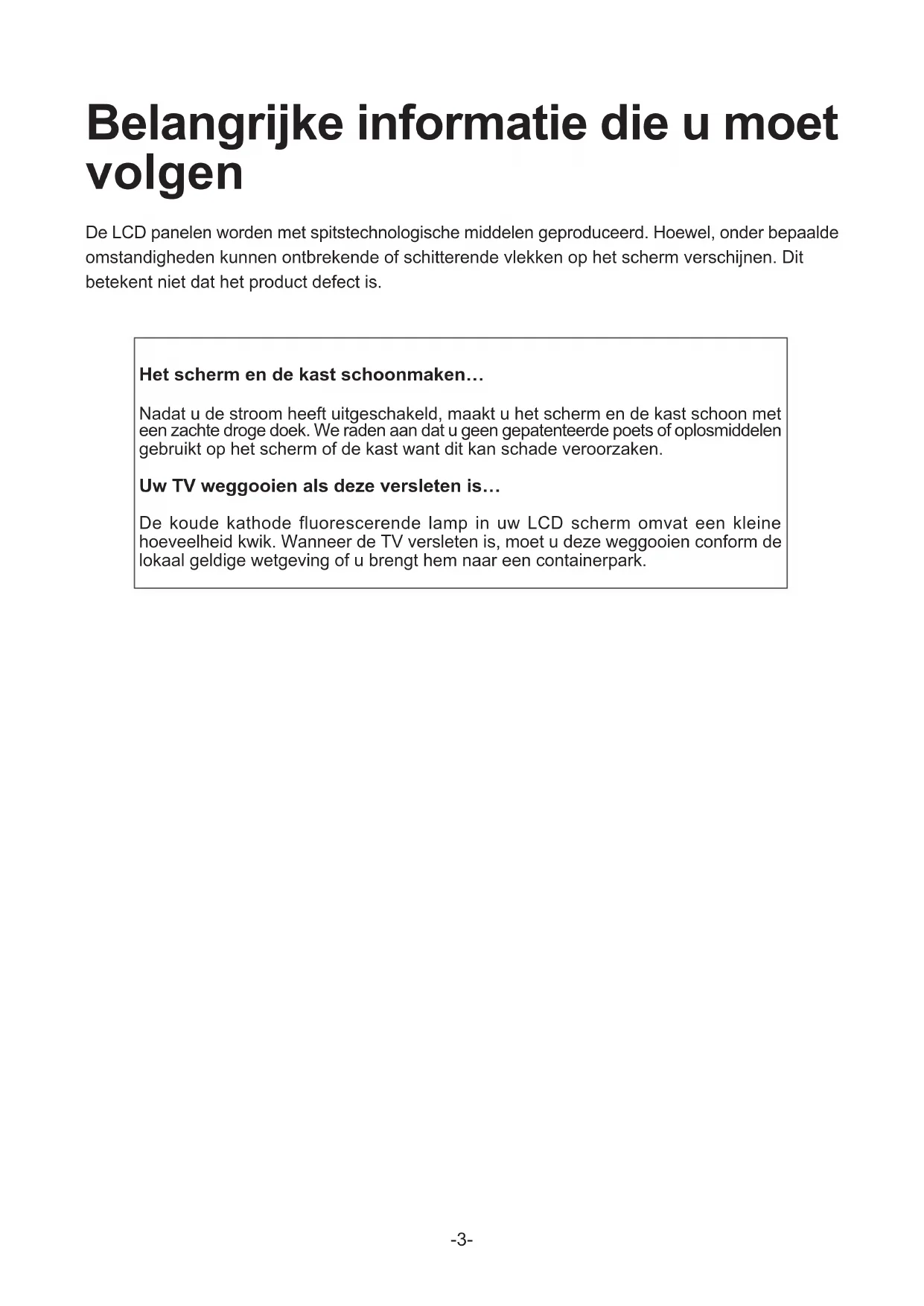 - Technische specificatie tabel: -2-Belangrijke informatie die u moet volgen De LCD panelen worden met spitstechnologische middelen geproduceerd. Hoewel, onder bepaalde omstandigheden kunnen ontbrekende of schitterende vlekken op het scherm verschijnen. Dit betekent niet dat het product defect is. Het scherm en de kast schoonmaken… Nadat u de stroom heeft uitgeschakeld, maakt u het scherm en de kast schoon met een zachte droge doek. We raden aan dat u geen gepatenteerde poets of oplosmiddelen gebruikt op het scherm of de kast want dit kan schade veroorzaken. Uw TV weggooien als deze versleten is… De koude kathode fluorescerende lamp in uw LCD scherm omvat een kleine hoeveelheid kwik. Wanneer de TV versleten is, moet u deze weggooien conform de lokaal geldige wetgeving of u brengt hem naar een containerpark. -3-Uw televisie Wij rekenen erop dat dit product, vervaardigd in moderne faciliteiten met volledige naleving van kwalitatief hoogstaande normen, u optimale prestaties zal leveren. Daarom vragen we u deze volledige handleiding te lezen voor u het product in gebruik neemt en bewaar hem voor eventuele raadpleging in de toekomst. Speciale Functies p. 21