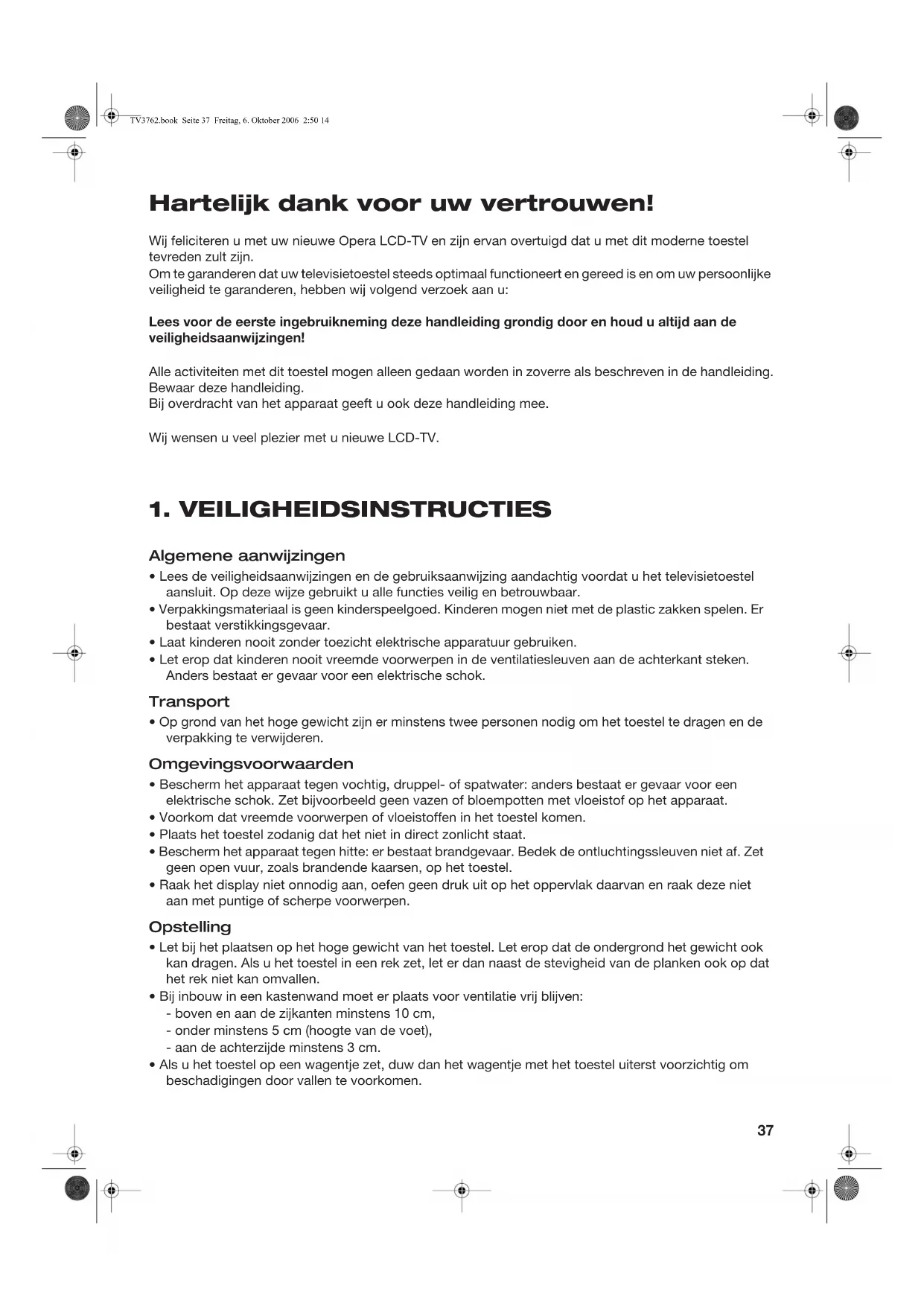 - 17. Garantievoorwaarden TV3762.book Seite 36 Freitag, 6. Oktober 2006 2:50 1437 Hartelijk dank voor uw vertrouwen! Wij feliciteren u met uw nieuwe Opera LCD-TV en zijn ervan overtuigd dat u met dit moderne toestel tevreden zult zijn. Om te garanderen dat uw televisietoestel steeds optimaal functioneert en gereed is en om uw persoonlijke veiligheid te garanderen, hebben wij volgend verzoek aan u: Lees voor de eerste ingebruikneming deze handleiding grondig door en houd u altijd aan de veiligheidsaanwijzingen! Alle activiteiten met dit toestel mogen alleen gedaan worden in zoverre als beschreven in de handleiding. Bewaar deze handleiding. Bij overdracht van het apparaat geeft u ook deze handleiding mee. Wij wensen u veel plezier met u nieuwe LCD-TV. p. 68
