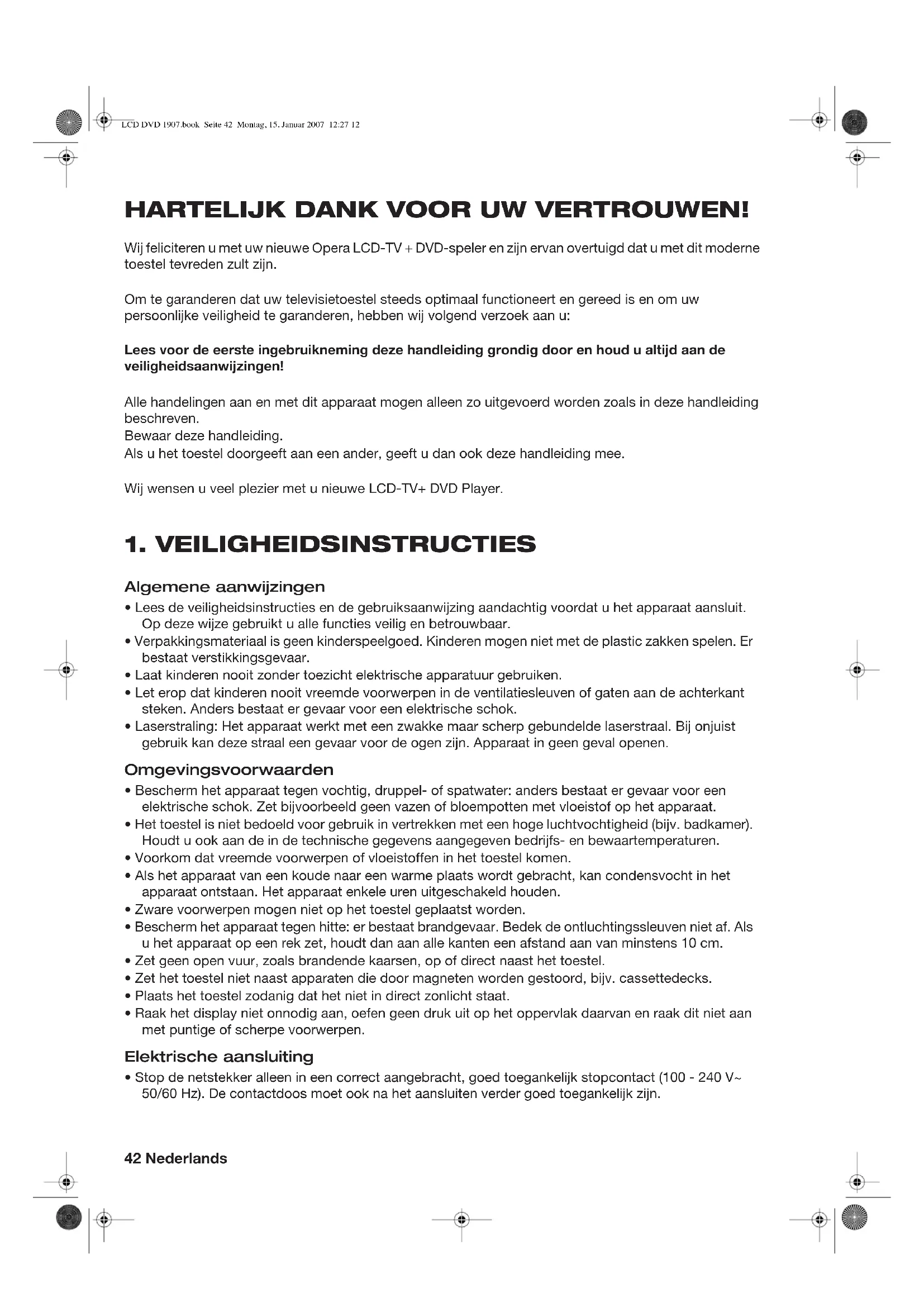 - 18. Garantievoorwaarden LCD DVD 1907.book Seite 41 Montag, 15. Januar 2007 12:27 1242 Nederlands HARTELIJK DANK VOOR UW VERTROUWEN! Wij feliciteren u met uw nieuwe Opera LCD-TV + DVD-speler en zijn ervan overtuigd dat u met dit moderne toestel tevreden zult zijn. Om te garanderen dat uw televisietoestel steeds optimaal functioneert en gereed is en om uw persoonlijke veiligheid te garanderen, hebben wij volgend verzoek aan u: Lees voor de eerste ingebruikneming deze handleiding grondig door en houd u altijd aan de veiligheidsaanwijzingen! Alle handelingen aan en met dit apparaat mogen alleen zo uitgevoerd worden zoals in deze handleiding beschreven. Bewaar deze handleiding. Als u het toestel doorgeeft aan een ander, geeft u dan ook deze handleiding mee. Wij wensen u veel plezier met u nieuwe LCD-TV+ DVD Player. p. 74