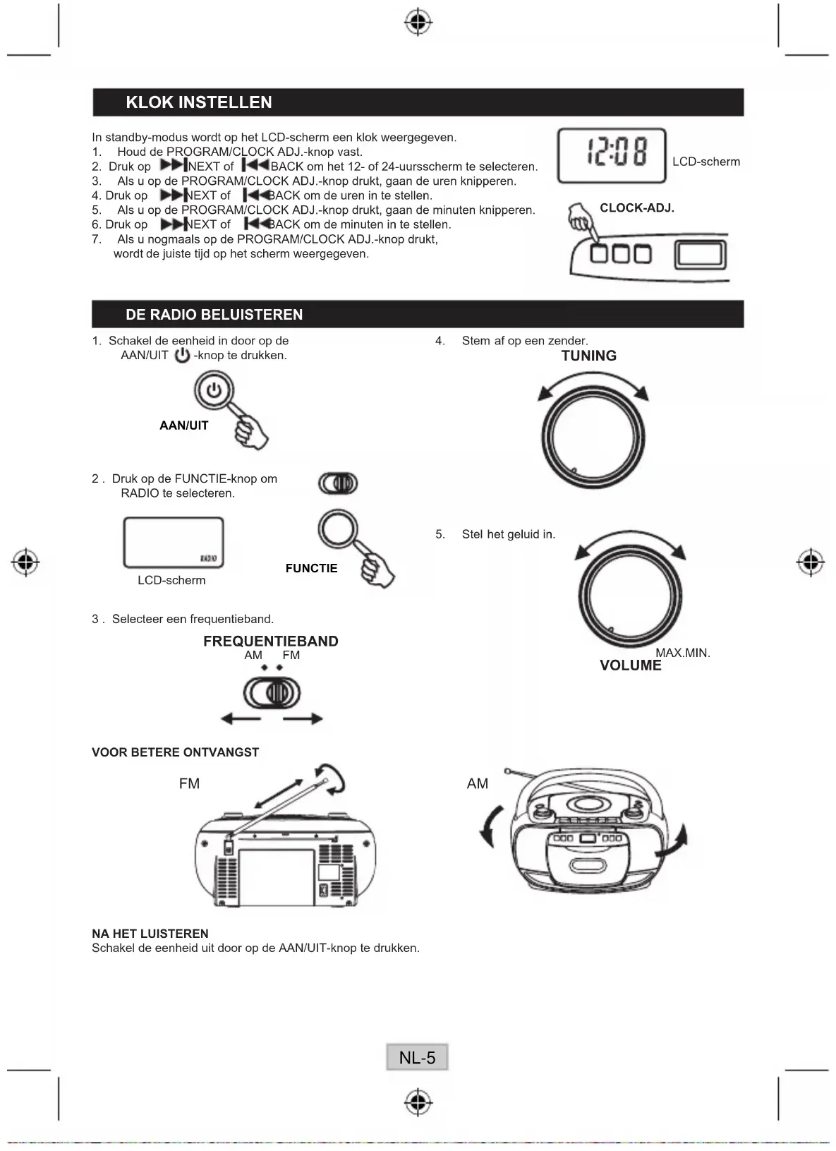FUNCTIE-knop om CD of RADIO te selecteren. Opnemen van de Radio Opnemen van een CD NL-8SPECIFICATIES CASSETTESECTIE Spoorindeling: 2-sporen stereo Opnamesysteem: Voormagnetisering Wissysteem: Magnetischeverwijdering6polen Bandsnelheid: 4,75cm/sec. F.F.- en REW-tijd: 170 sec. (F-60-cassettes) Frequentierespons: 125Hz-8000Hz(Normal-cassette) CD-SECTIE Kanalen: 2 kanalen S/R-verhouding: 60dB Wowenutter nietdetecteerbaar Samplingfrequentie: 44,1kHz8xoversampling Kwantisering: 1-bitsDA-converter Lichtbron pick-up: Halfgeleiderlaser Golengtepick-up 790nm RADIOSECTIE Frequentiebereik: FM87.5 -108MHz AM522-1620kHz Antennes: IngebouwdeAM-ferrietstaaf FM-staafantenne ALGEMEEN Uitgangsvermogen: 1,2 W + 1,2 W (RMS) Energieverbruik: 9,5W AuxIn-aansluiting: 3,5MM Luidspreker: 3"8OHM Voedingsbron: Wisselspanning:230V~50Hz Batterijen:9V(6x1,5VLR14/"C"/UM2) Afmetingen: 294(L)x206(D)x153(H)mm Gewicht 1,72KG Vanw ege voor tdurende prod uctverbeteringen kunn