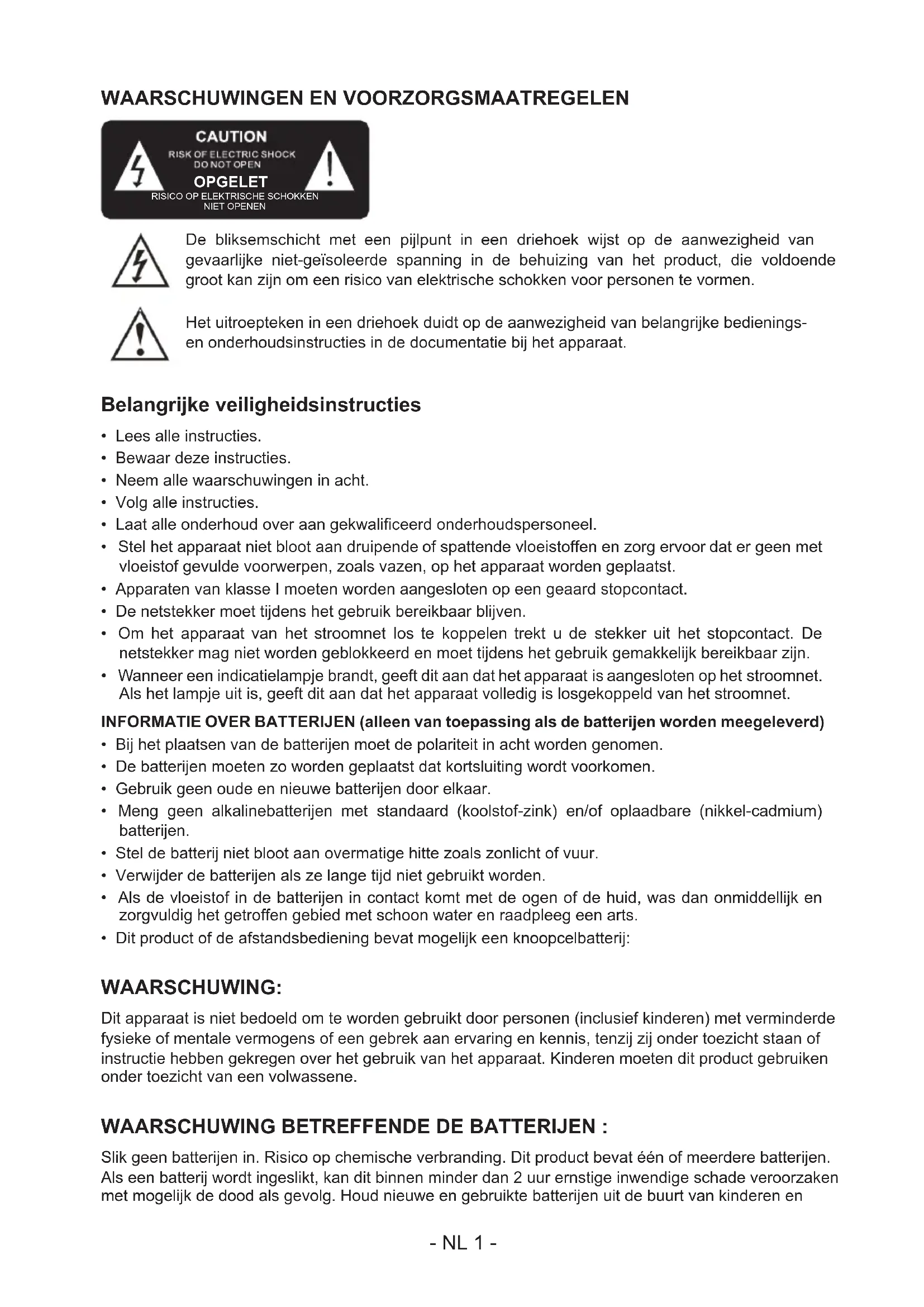 - Dit product of de afstandsbediening bevat mogelijk een knoopcelbatterij: WAARSCHUWING: Dit apparaat is niet bedoeld om te worden gebruikt door personen (inclusief kinderen) met verminderde fysieke of mentale vermogens of een gebrek aan ervaring en kennis, tenzij zij onder toezicht staan of instructie hebben gekregen over het gebruik van het apparaat. Kinderen moeten dit product gebruiken onder toezicht van een volwassene. WAARSCHUWING BETREFFENDE DE BATTERIJEN : Slik geen batterijen in. Risico op chemische verbranding. Dit product bevat één of meerdere batterijen. Als een batterij wordt ingeslikt, kan dit binnen minder dan 2 uur ernstige inwendige schade veroorzaken met mogelijk de dood als gevolg. Houd nieuwe en gebruikte batterijen uit de buurt van kinderen en- NL 2 - kwetsbare personen. Als het batterijvakje niet goed gesloten kan worden, gebruik het product dan niet meer. Als een batterij wordt ingeslikt, raadpleeg dan onmiddellijk naar een arts. BELANGRIJKE OPMERKINGEN : Er bestaat explosiegevaar als de batterij(en) niet op de juiste wijze wordt (worden) vervangen of als het product gedurende lange tijd niet wordt gebruikt terwijl de batterijen nog steeds in het apparaat zitten. Vervang oude batterijen door identieke of soortgelijke modellen. dubbele isolatie gelijkstroom wisselstroom Symbool voor gebruik binnenshuis Zorg voor het milieu Uw product is ontworpen en geproduceerd met hoogwaardige materialen en componenten, die gerecycled en hergebruikt kunnen worden. Uw product bevat batterijen die onder de Europese Richtlijn 2006/66/EG vallen en die niet met het normale huisvuil kunnen worden weggegooid. Informeer u over de lokale regels voor het gescheiden inzamelen van batterijen. Een correcte verwijdering van de batterijen helpt om negatieve gevolgen voor het milieu en de menselijke gezondheid te voorkomen. Wanneer dit symbool met een doorgestreepte vuilnisbak op een product is aangebracht, betekent dit dat het product onder de Europese richtlijn 2002/96/EG valt. Informeer u over het lokale gescheiden inzamelingssysteem voor elektrische en elektronische producten. Handel volgens de plaatselijke regels en gooi uw oude producten niet bij het normale huisvuil. Een correcte verwijdering van uw oude product helpt om mogelijke negatieve gevolgen voor het milieu en de menselijke gezondheid te voorkomen. Naleving Dit product voldoet aan de eisen voor radiointerferentie van de Europese Gemeenschap. Dit etiket is deel van het apparaat.- NL 3 - Batterijvoeding:
