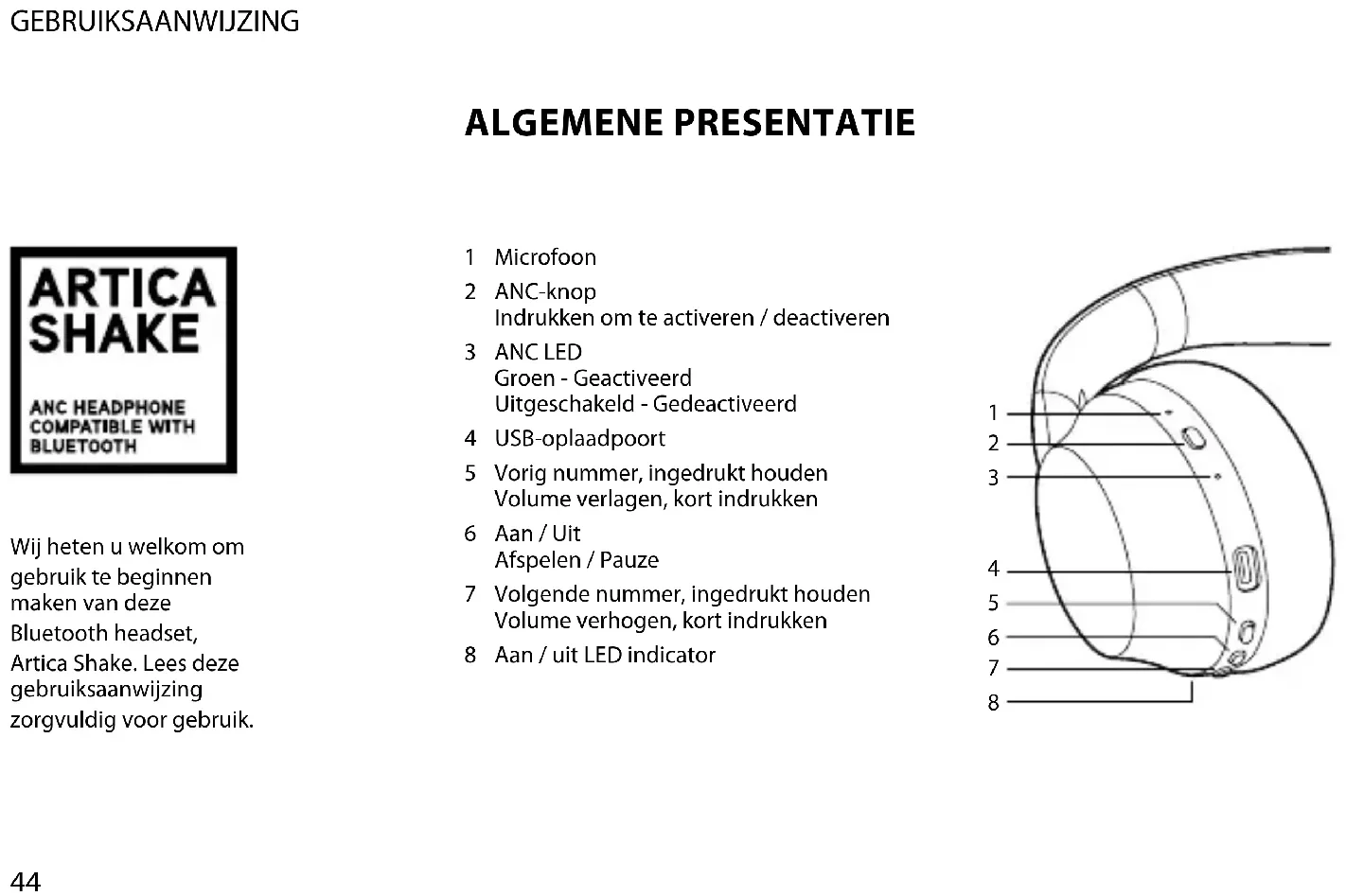 ALGEMENE PRESENTATIE Wij heten u welkom om gebruik te beginnen maken van deze Bluetooth headset, Artica Shake. Lees deze gebruiksaanwijzing zorgvuldig voor gebruik.