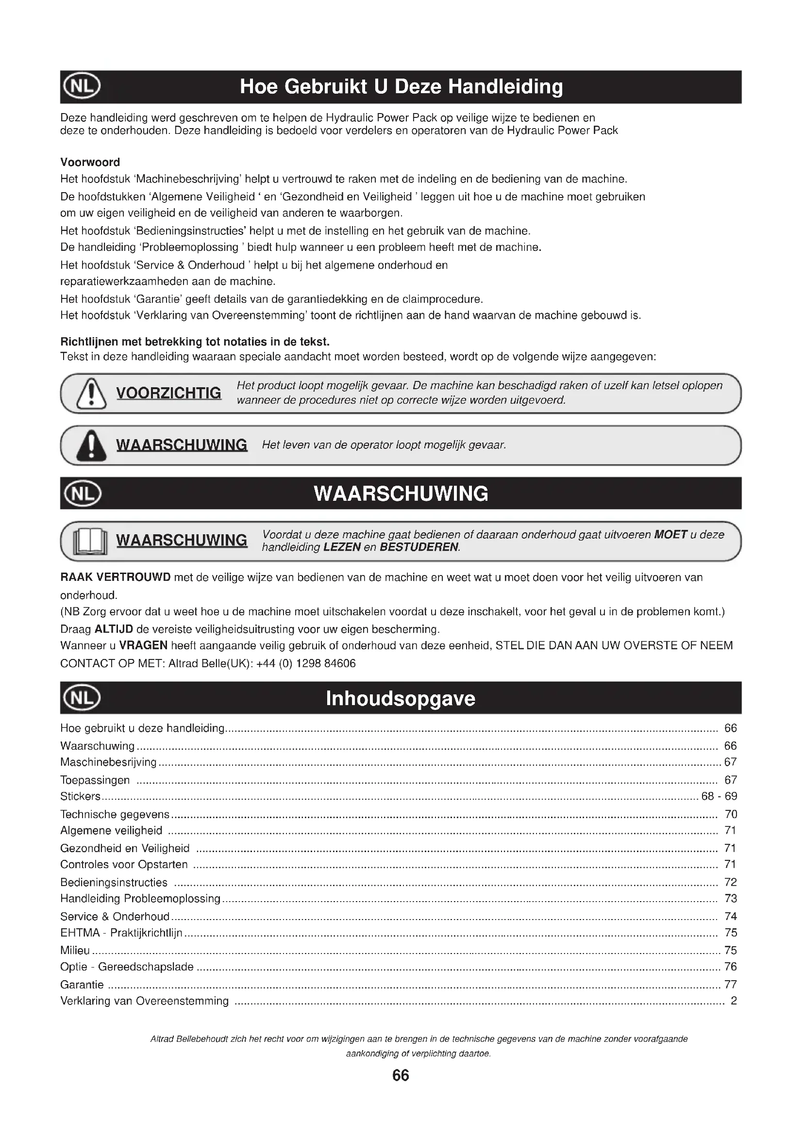 - Vela de ignição do motor A “Altrad Belle” e/ou os seus agentes autorizados, directores, empregados ou seguradores não serão considerados responsáveis por danos, perdas ou despesas, consequentes ou outros, relativos ou devido a incapacidade de usar a máquina para qualquer ¿ nalidade. Reclamações de Garantia. Todas as reclamações de garantia deverão ser primeiramente dirigidas ao Altrad Belle, por telefone, fax, E-mail ou por escrito. Reclamações de Garantia. Tel : +44 (0)1298 84606, Fax : +44 (0)1298 84073, Email : Warranty@belle-group.co.uk Para reclamações de garantia: Altrad Belle Departamento de Garantias, Sheen, Nr. Buxton Derbyshire SK17 0EU Inglaterra Registo de Garantia: Seguindo o compromisso que assumiu para ser mais ecológica e respeitadora do ambiente, a ALTRAD Belle acaba de lançar o registo online da Garantia. Para aceder à página de registo do website, utilize o seguinte endereço:- http://www.bellegroup.com/index.php?p=warranty_registration Em alternativa, também pode digitalizar o Código QR (código de resposta rápida) com o seu smartphone para aceder à página de registo.66 Hoe Gebruikt U Deze Handleiding Deze handleiding werd geschreven om te helpen de Hydraulic Power Pack op veilige wijze te bedienen en deze te onderhouden. Deze handleiding is bedoeld voor verdelers en operatoren van de Hydraulic Power Pack Voorwoord Het hoofdstuk ‘Machinebeschrijving’ helpt u vertrouwd te raken met de indeling en de bediening van de machine. De hoofdstukken ‘Algemene Veiligheid ‘ en ‘Gezondheid en Veiligheid ’ leggen uit hoe u de machine moet gebruiken om uw eigen veiligheid en de veiligheid van anderen te waarborgen. Het hoofdstuk ‘Bedieningsinstructies’ helpt u met de instelling en het gebruik van de machine. De handleiding ‘Probleemoplossing ’ biedt hulp wanneer u een probleem heeft met de machine. Het hoofdstuk ‘Service & Onderhoud ’ helpt u bij het algemene onderhoud en reparatiewerkzaamheden aan de machine. Het hoofdstuk ‘Garantie’ geeft details van de garantiedekking en de claimprocedure. Het hoofdstuk ‘Verklaring van Overeenstemming’ toont de richtlijnen aan de hand waarvan de machine gebouwd is. Richtlijnen met betrekking tot notaties in de tekst. Tekst in deze handleiding waaraan speciale aandacht moet worden besteed, wordt op de volgende wijze aangegeven: Het product loopt mogelijk gevaar. De machine kan beschadigd raken of uzelf kan letsel oplopen wanneer de procedures niet op correcte wijze worden uitgevoerd. VOORZICHTIG Het leven van de operator loopt mogelijk gevaar. WAARSCHUWING WAARSCHUWING Inhoudsopgave RAAK VERTROUWD met de veilige wijze van bedienen van de machine en weet wat u moet doen voor het veilig uitvoeren van onderhoud. (NB Zorg ervoor dat u weet hoe u de machine moet uitschakelen voordat u deze inschakelt, voor het geval u in de problemen komt.) Draag ALTIJD de vereiste veiligheidsuitrusting voor uw eigen bescherming. Wanneer u VRAGEN heeft aangaande veilig gebruik of onderhoud van deze eenheid, STEL DIE DAN AAN UW OVERSTE OF NEEM CONTACT OP MET: Altrad Belle(UK): +44 (0) 1298 84606 Hoe gebruikt u deze handleiding............................................................................................................................................................ 66 Waarschuwing ........................................................................................................................................................................................ 66 Maschinebesrijving .................................................................................................................................................................................. 67 Toepassingen ........................................................................................................................................................................................ 67 Stickers ............................................................................................................................................................................................. 68 - 69 Technische gegevens ............................................................................................................................................................................. 70 Algemene veiligheid .............................................................................................................................................................................. 71 Gezondheid en Veiligheid ..................................................................................................................................................................... 71 Controles voor Opstarten ...................................................................................................................................................................... 71 Bedieningsinstructies ............................................................................................................................................................................ 72 Handleiding Probleemoplossing ............................................................................................................................................................. 73 Service & Onderhoud ............................................................................................................................................................................. 74 EHTMA - Praktijkrichtlijn ......................................................................................................................................................................... 75 Milieu ....................................................................................................................................................................................................... 75 Optie - Gereedschapslade ...............................................................