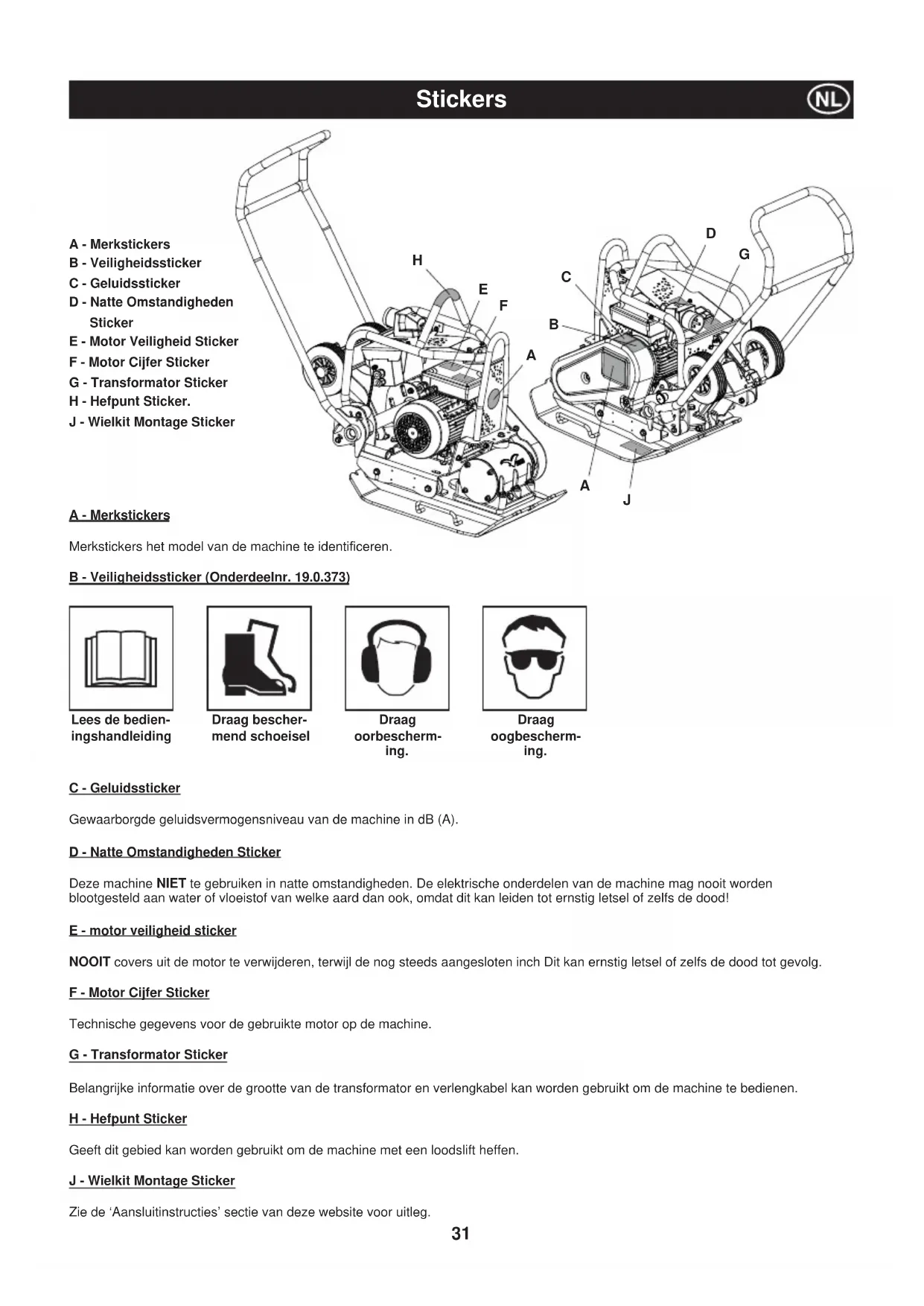 A - Merkstickers Merkstickers het model van de machine te identi¿ ceren. B - Veiligheidssticker (Onderdeelnr. 19.0.373) Lees de bedien- ingshandleiding Draag bescher- mend schoeisel Draag oorbescherm- ing. Draag oogbescherm- ing. C - Geluidssticker Gewaarborgde geluidsvermogensniveau van de machine in dB (A). D - Natte Omstandigheden Sticker Deze machine NIET te gebruiken in natte omstandigheden. De elektrische onderdelen van de machine mag nooit worden blootgesteld aan water of vloeistof van welke aard dan ook, omdat dit kan leiden tot ernstig letsel of zelfs de dood! E - motor veiligheid sticker NOOIT covers uit de motor te verwijderen, terwijl de nog steeds aangesloten inch Dit kan ernstig letsel of zelfs de dood tot gevolg. F - Motor Cijfer Sticker Technische gegevens voor de gebruikte motor op de machine. G - Transformator Sticker Belangrijke informatie over de grootte van de transformator en verlengkabel kan worden gebruikt om de machine te bedienen. H - Hefpunt Sticker Geeft dit gebied kan worden gebruikt om de machine met een loodslift heffen. J - Wielkit Montage Sticker Zie de ‘Aansluitinstructies’ sectie van deze website voor uitleg. Stickers A - Merkstickers B - Veiligheidssticker C - Geluidssticker D - Natte Omstandigheden Sticker E - Motor Veiligheid Sticker F - Motor Cijfer Sticker G - Transformator Sticker H - Hefpunt Sticker. J - Wielkit Montage Sticker