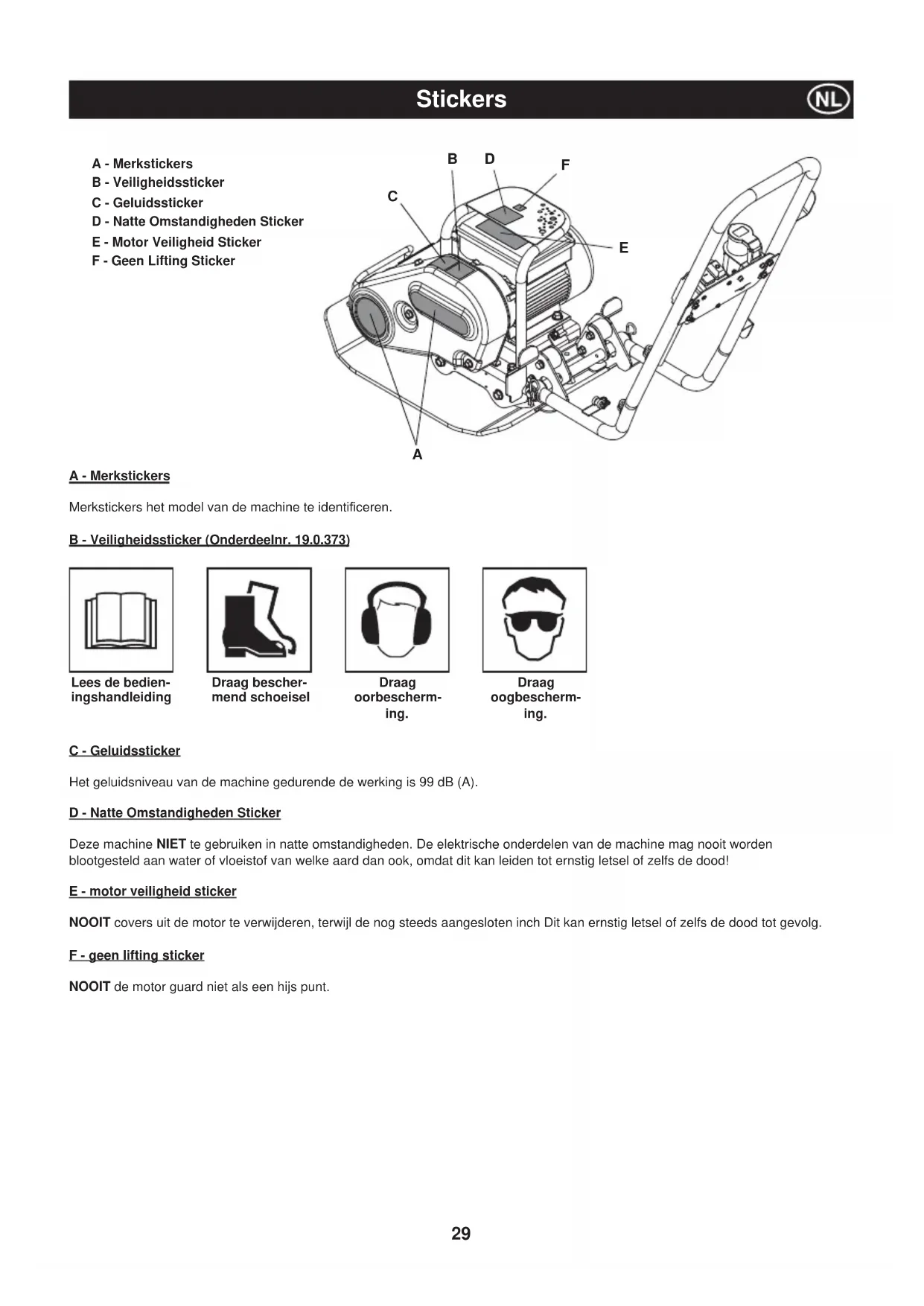 Technische gegevens29 A - Merkstickers Merkstickers het model van de machine te identi¿ ceren. B - Veiligheidssticker (Onderdeelnr. 19.0.373) Lees de bedien- ingshandleiding Draag bescher- mend schoeisel Draag oorbescherm- ing. Draag oogbescherm- ing. C - Geluidssticker Het geluidsniveau van de machine gedurende de werking is 99 dB (A). D - Natte Omstandigheden Sticker Deze machine NIET te gebruiken in natte omstandigheden. De elektrische onderdelen van de machine mag nooit worden blootgesteld aan water of vloeistof van welke aard dan ook, omdat dit kan leiden tot ernstig letsel of zelfs de dood! E - motor veiligheid sticker NOOIT covers uit de motor te verwijderen, terwijl de nog steeds aangesloten inch Dit kan ernstig letsel of zelfs de dood tot gevolg. F - geen lifting sticker NOOIT de motor guard niet als een hijs punt. A - Merkstickers B - Veiligheidssticker C - Geluidssticker D - Natte Omstandigheden Sticker E - Motor Veiligheid Sticker F - Geen Lifting Sticker