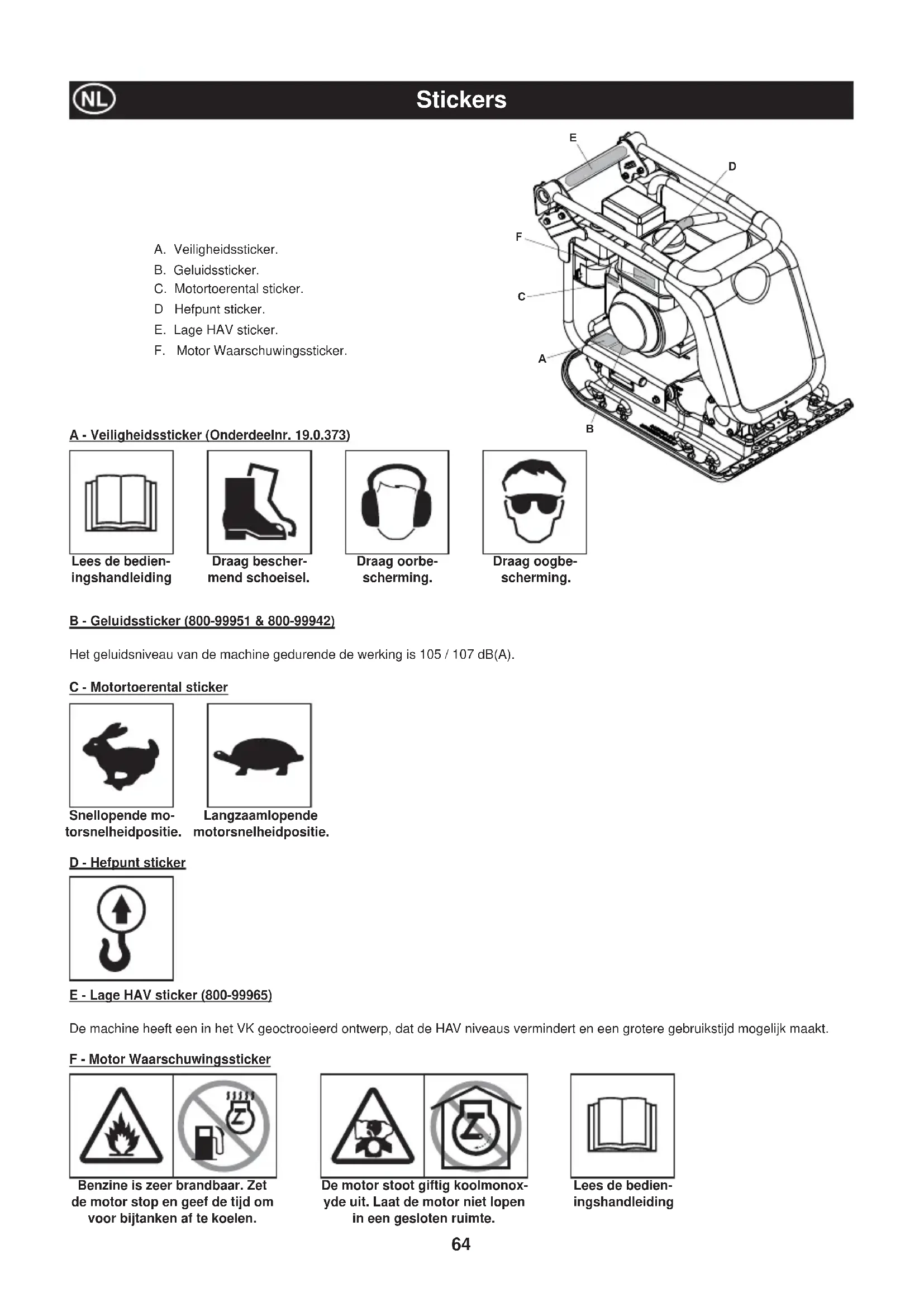 ) 2.45 2.64 Gebruiksduur - Honda (Mins) 831 342 Gebruiksduur - Hatz (Mins) 499 43064 Stickers A - Veiligheidssticker (Onderdeelnr. 19.0.373) Lees de bedien- ingshandleiding Draag bescher- mend schoeisel. Draag oorbe- scherming. Draag oogbe- scherming. B - Geluidssticker (800-99951 & 800-99942) Het geluidsniveau van de machine gedurende de werking is 105 / 107 dB(A). C - Motortoerental sticker A. Veiligheidssticker. B. Geluidssticker. C. Motortoerental sticker. D Hefpunt sticker. E. Lage HAV sticker. F. Motor Waarschuwingssticker. Snellopende mo- torsnelheidpositie. Langzaamlopende motorsnelheidpositie. D - Hefpunt sticker E - Lage HAV sticker (800-99965) De machine heeft een in het VK geoctrooieerd ontwerp, dat de HAV niveaus vermindert en een grotere gebruikstijd mogelijk maakt. F - Motor Waarschuwingssticker Lees de bedien- ingshandleiding Benzine is zeer brandbaar. Zet de motor stop en geef de tijd om voor bijtanken af te koelen. De motor stoot giftig koolmonox- yde uit. Laat de motor niet lopen in een gesloten ruimte.