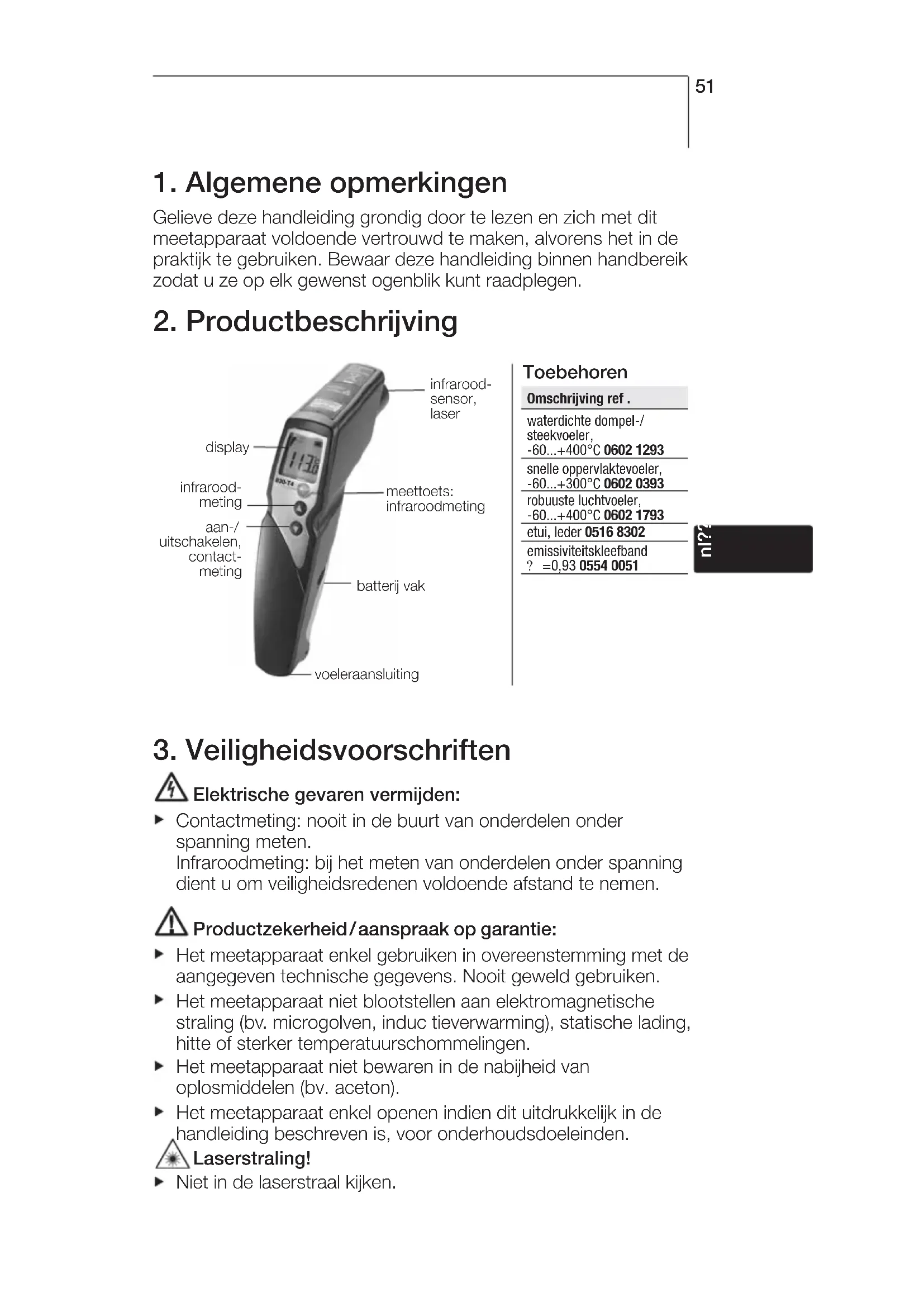Elektrische gevaren vermijden: Contactmeting: nooit in de buurt van onderdelen onder spanning meten. Infraroodmeting: bij het meten van onderdelen onder spanning dient u om veiligheidsredenen voldoende afstand te nemen. Productzekerheid / aanspraak op garantie: Het meetapparaat enkel gebruiken in overeenstemming met de aangegeven technische gegevens. Nooit geweld gebruiken. Het meetapparaat niet blootstellen aan elektromagnetische straling (bv . microgolven, induc tieverwarming), statische lading, hitte of sterker temperatuurschommelingen. Het meetapparaat niet bewaren in de nabijheid van oplosmiddelen (bv. aceton). Het meetapparaat enkel openen indien dit uitdrukkelijk in de handleiding beschr even is, voor onderhoudsdoeleinden. Laserstraling! Niet in de laserstraal kijken. deenfr esitptsv nl???? infrarood- sensor, laser batterij vak display aan-/ uitschakelen, contact- meting meettoets: infraroodmeting infrarood- meting voeleraansluiting Toebehoren Omschrijving ref . waterdichte dompel-/ steekvoeler