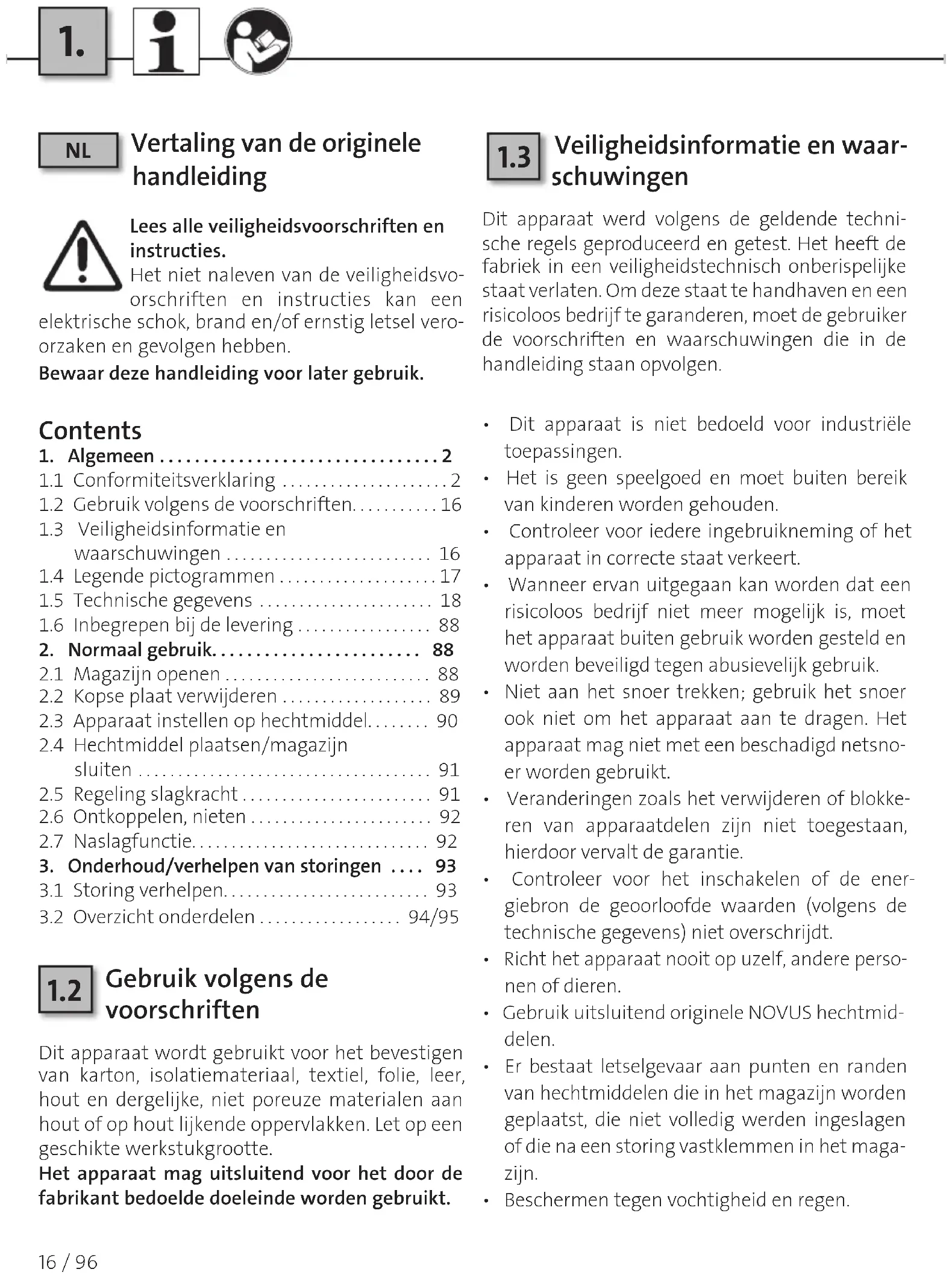 . Conformiteitsverklaring ..................... . Gebruik volgens de voorschriften........... . Veiligheidsinformatie en waarschuwingen .......................... . Legende pictogrammen .................... . Technische gegevens ...................... . Inbegrepen bij de levering .................