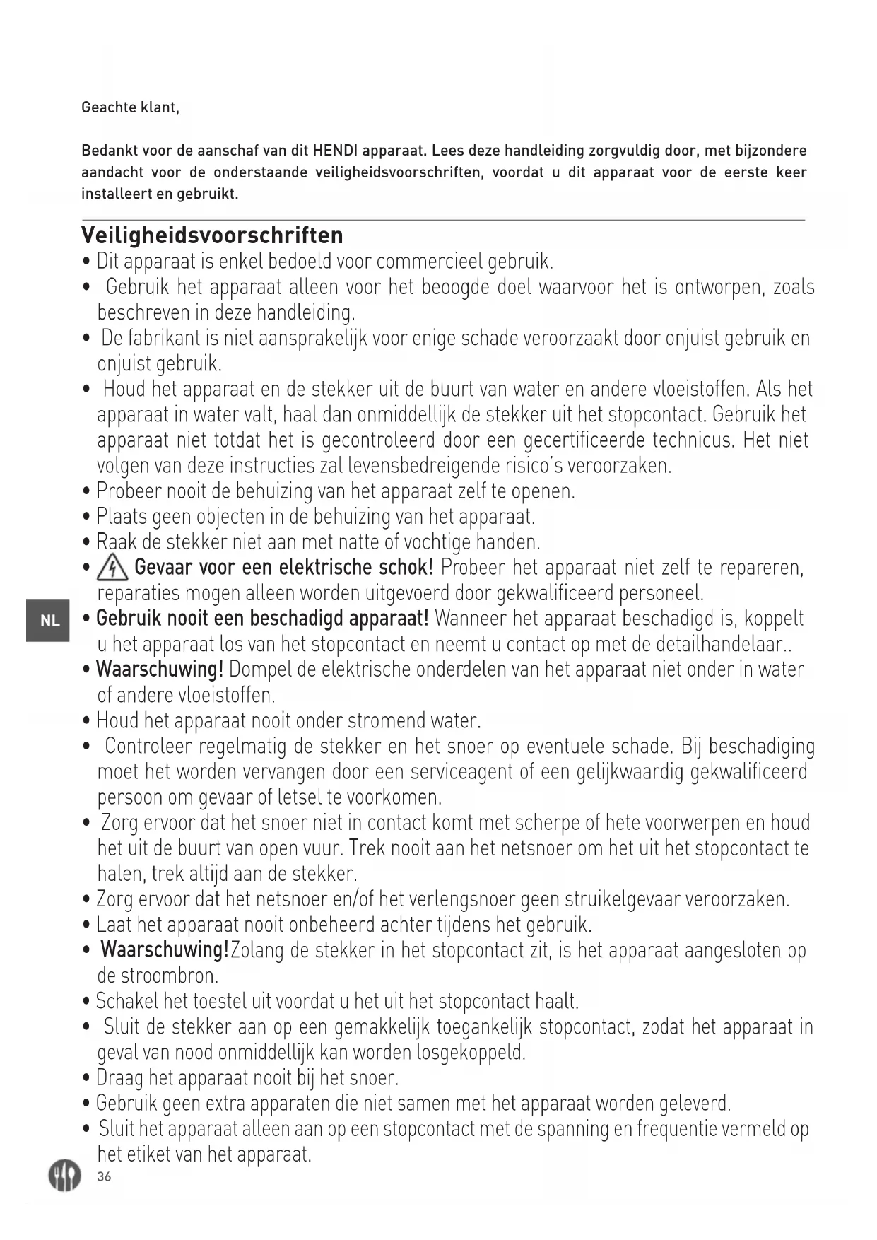 Geachte klant, Bedankt voor de aanschaf van dit HENDI apparaat. Lees deze handleiding zorgvuldig door, met bijzondere aandacht voor de onderstaande veiligheidsvoorschriften, voordat u dit apparaat voor de eerste keer installeert en gebruikt. Veiligheidsvoorschriften