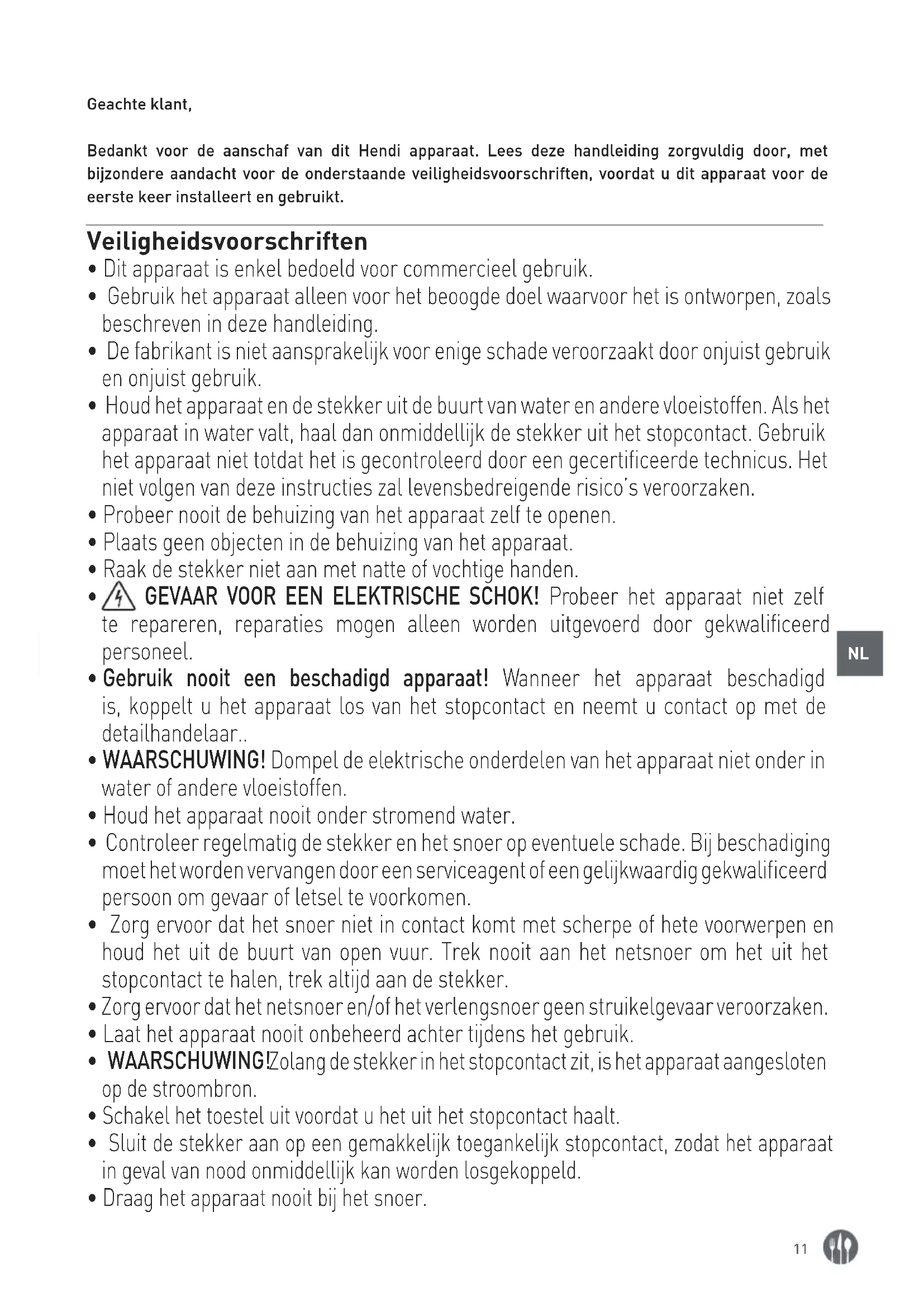 Geachte klant, Bedankt voor de aanschaf van dit Hendi apparaat. Lees deze handleiding zorgvuldig door, met bijzondere aandacht voor de onderstaande veiligheidsvoorschriften, voordat u dit apparaat voor de eerste keer installeert en gebruikt. Veiligheidsvoorschriften
